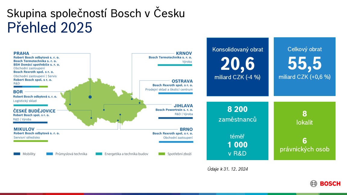 V roce 2024 Bosch dosáhl na českém trhu obratu ve výši 20,6 miliardy Kč (zhruba 820 milionů eur), což meziročně představuje v korunách pokles o 4 procenta. Celkový obrat skupiny společností Bosch v Česku včetně exportu dosáhl 55,5 miliardy Kč (2,2 miliardy eur) a meziročně se tak v korunách zvýšil o 0,6 procent. „Pokles obratu souvisí s náročnou hospodářskou situací v Česku, hlavně v průmyslových odvětvích a s tím souvisejícím nižším objemem investic. Nejistota v dalších krocích transformace automobilového průmyslu, vysoké ceny energií, ale i povodně patřily k hlavním faktorům poklesu. Příznivější situace byla v oblastech spotřebního zboží, kde se díky širokému výrobkovému portfoliu dařilo reagovat na potřeby našich zákazníků. „Rád bych poděkoval našim zaměstnancům za jejich nasazení a našim zákazníkům za dobrou spolupráci,“ řekl Milan Šlachta, reprezentant skupiny společností Bosch v Česku. Bosch má v Česku široké zastoupení se všemi svými čtyřmi obchodními oblastmi: Mobilita, Průmyslová technika, Spotřební zboží a Energetika a technika budov. „Chtěl bych ocenit úsilí našich spolupracovníků v závodě na výrobu tepelné techniky v Krnově během povodní. Svým mimořádným nasazením úspěšně zvládli odstranit následky zaplavení závodu,“ dodal Šlachta. Bosch finančně podpořil pro zmírnění následků živelné pohromy Město Krnov, Český červený kříž a nadaci Člověka v tísni. K 31. prosinci 2024 Bosch zaměstnával v Česku zhruba 8 200 lidí. V jižních Čechách a na Vysočině patří Bosch k největším a nejznámějším zaměstnavatelům. V oblasti vývoje pracuje téměř 1 000 spolupracovníků, většina z nich v českobudějovickém vývojovém centru, ale také v Jihlavě a v Praze. V roce 2024 Bosch investoval 2,6 miliardy Kč (103 milionů eur), z toho nejvíce do moderních výrobních technologií pro rozjezd výroby elektrických pohonů pro bateriová vozidla v jihlavském výrobním závodě. Dále pak Bosch pokračoval v projektech automatizace a digitalizace procesů ve výrobě a v logistice. „Rok 2025 bude pro Bosch na českém trhu opět náročný, ale díky inovačnímu potenciálu našich zaměstnanců a inovativním produktům věříme v naší silnou pozici na českému trhu. První kvartál roku 2025 vykazuje pozitivní vývoj“ uvedl Šlachta.