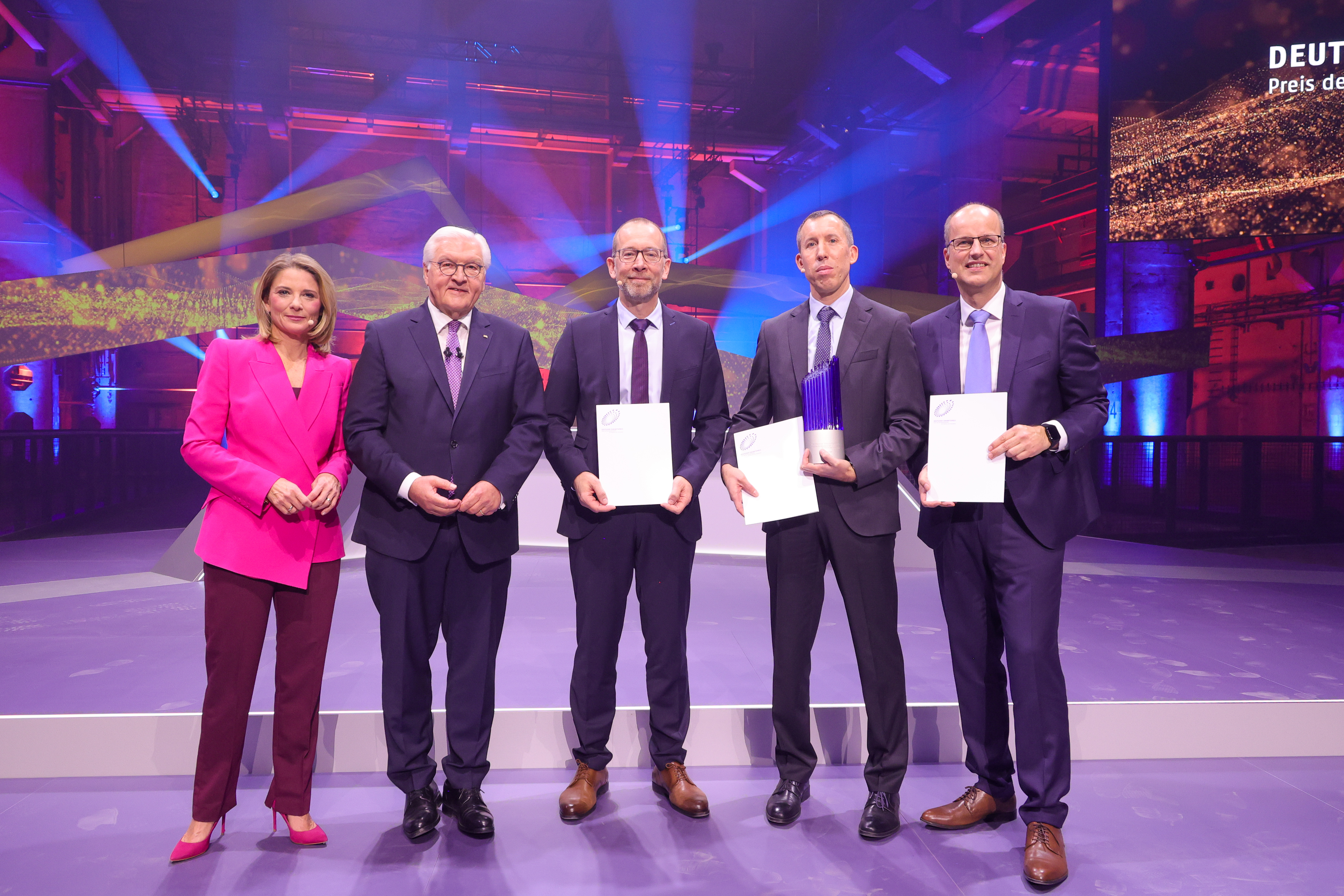Das Gewinnerteam mit dem Bundespräsidenten - Kai Weeber, Pierre Andrieu und Christoffer Uhr zusammen mit Bundespräsident Frank-Walter Steinmeier und ZDF-Moderatorin Yve Fehring nach der Preisverleihung. Mit der prämierten Lösung leistet Bosch einen wichtigen Beitrag zur Klimaneutralität im Güterverkehr.