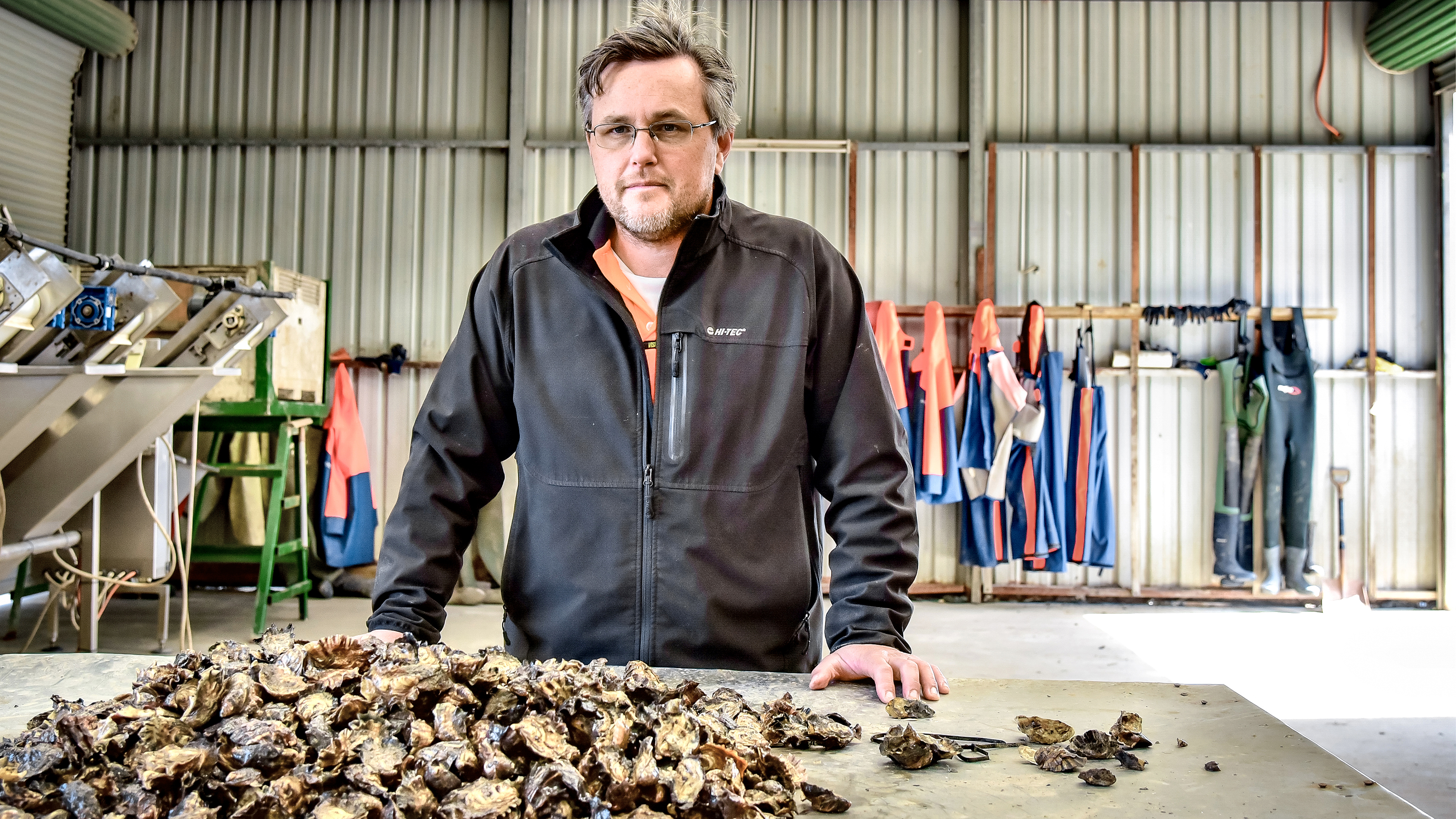 Austernzüchter Justin Goc steht in einer Halle neben einem Berg frischer Austern.