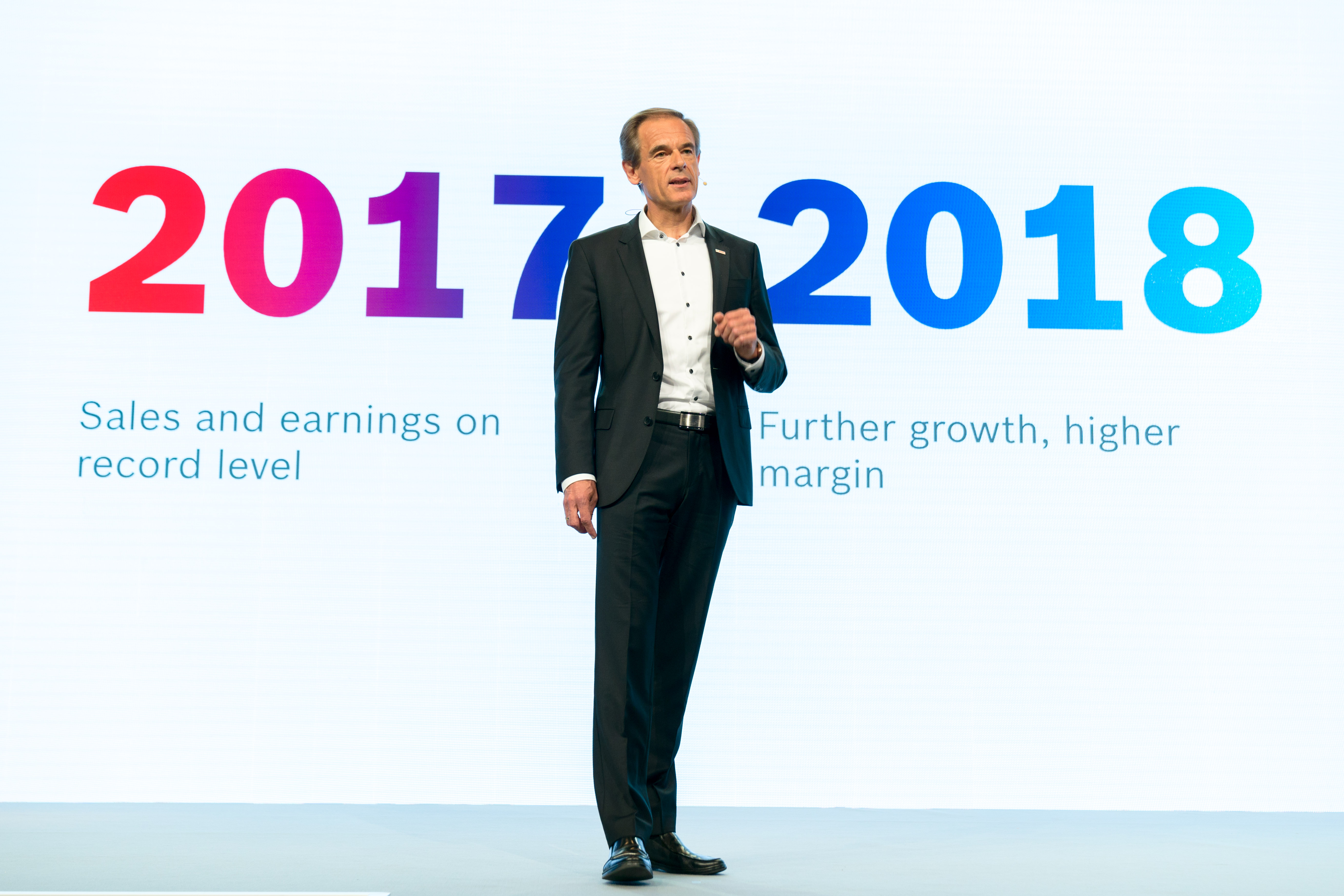 Dr. Volkmar Denner (im Bild), Vorsitzender der Geschäftsführung der Robert Bosch GmbH, bei der Bilanzpressekonferenz am Bosch-Forschungscampus in Renningen am 25. April 2018.
