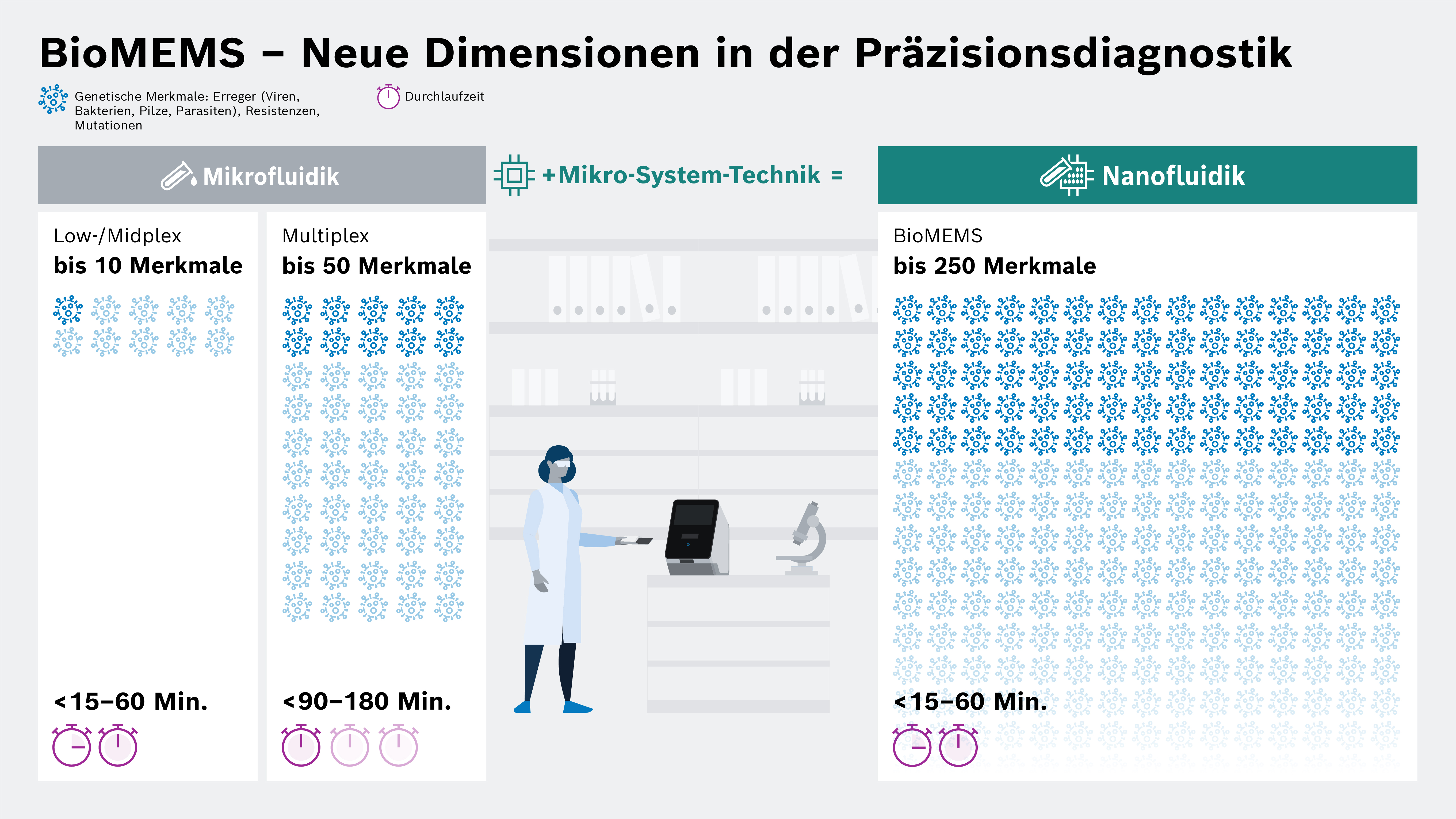 Die BioMEMS-Technologie ebnet den Weg in die Nanofluidik. Mit der neuen BioMEMS-Technologie ist der Nachweis von bis zu 250 genetischen Merkmalen4 (z. B. Erreger) in einer Kartusche vollautomatisiert in teils weniger als 15 Minuten möglich.