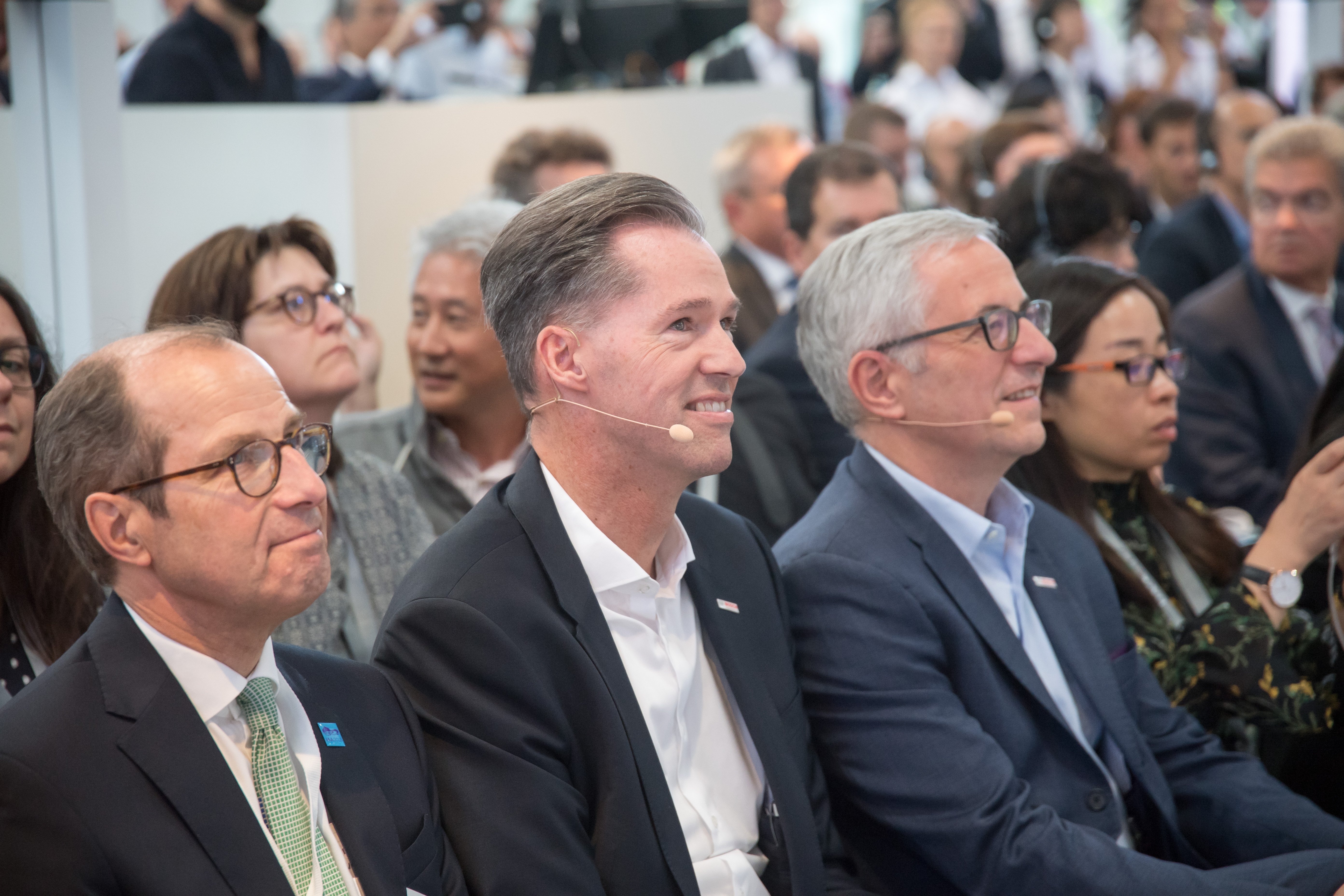 Klaus Bräunig (Geschäftsführer VDA), Dr. Markus Heyn und Dr. Rolf Bulander (Mitglieder der Geschäftsführung der Robert Bosch GmbH) auf der Bosch-Pressekonferenz am 19. September 2018 auf der IAA Nutzfahrzeuge in Hannover.