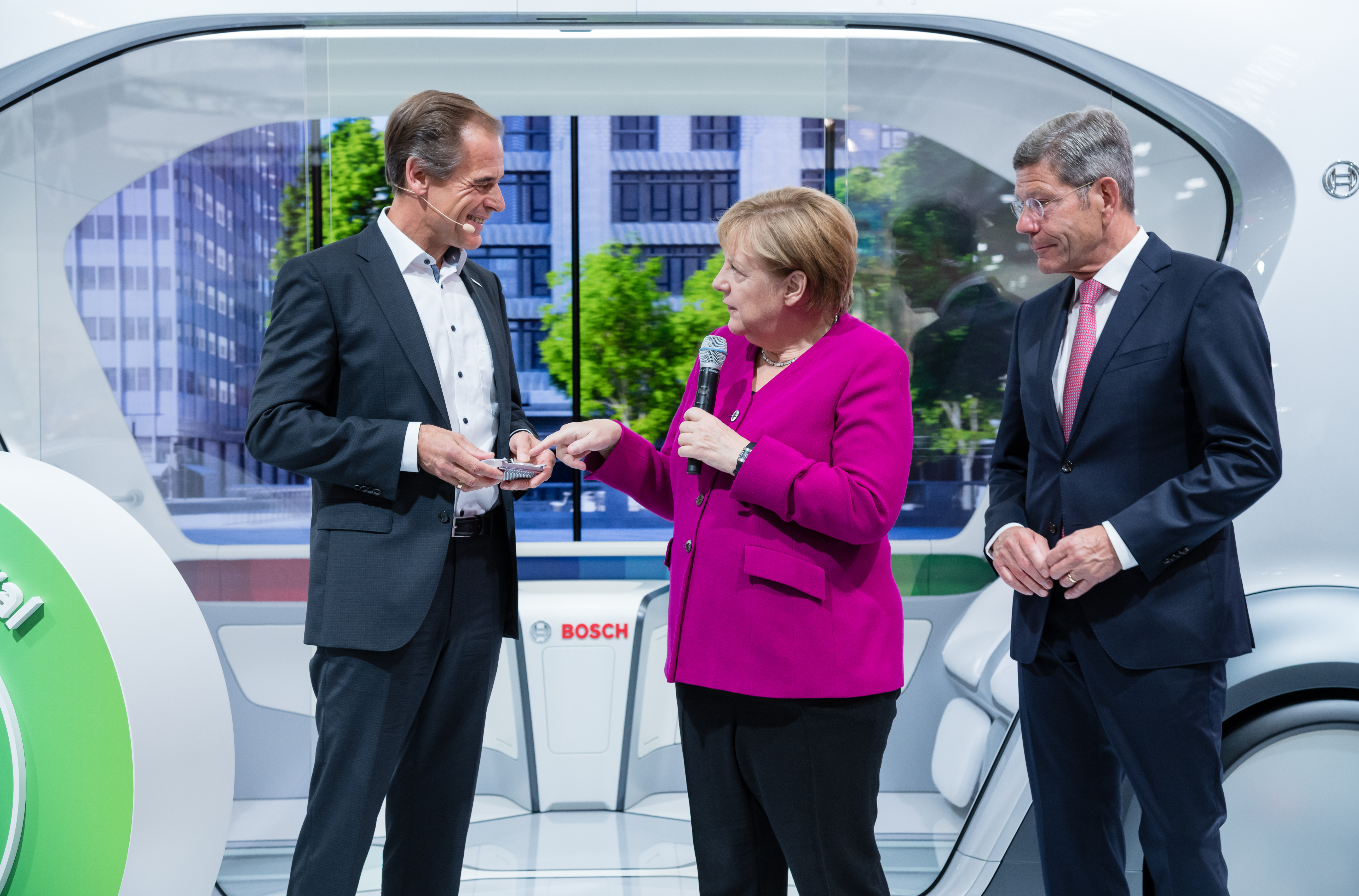 Dr. Volkmar Denner (links), Vorsitzender der Geschäftsführung der Robert Bosch GmbH, präsentiert Bundeskanzlerin Angela Merkel (Mitte) und VDA-Präsident Bernhard Mattes (rechts) die neue Frontkamera mit Künstlicher Intelligenz für automatisiertes Fahren auf der IAA 2019.