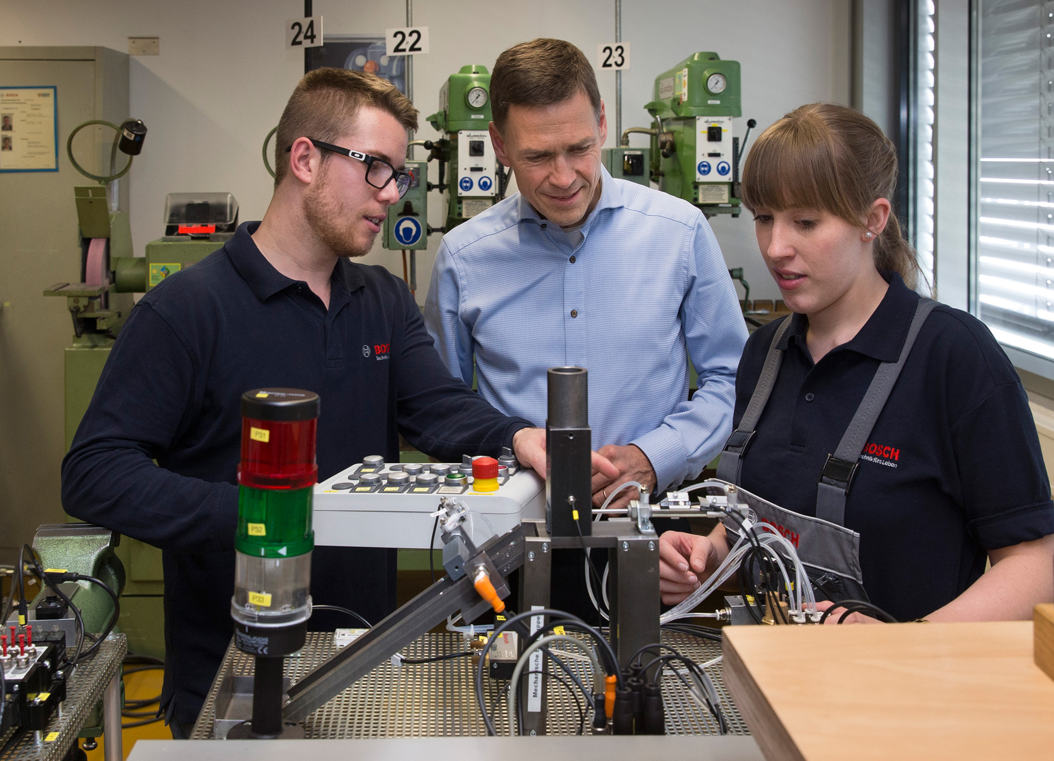 Bosch schafft erneut 75 Ausbildungsplätze für Jugendliche aus Italien und Spanien, um einen Beitrag gegen die hohe Jugendarbeitslosigkeit in diesen Ländern zu leisten. Damit setzt das Technologie- und Dienstleistungsunternehmen seine „Ausbildungsinitiative Südeuropa“ mit einem neuen Lehrlingsjahrgang fort. Bosch unterstützt die Azubis mit Sprachkursen, betrieblichen Mentoren und einer sozialpädagogischen Betreuung. Für das Engagement gegen Jugendarbeitslosigkeit in Südeuropa stellt Bosch in Summe 175 zusätzliche Ausbildungsplätze und rund 14 Millionen Euro bereit.<br><br>Im Bild: Bosch Geschäftsführer und Arbeitsdirektor Christoph Kübel mit den spanischen Auszubildenden Ana Maria San Andres Gonzalez und Juan Manuel Cañadas Torres. Beide lernen den Beruf des Mechatronikers bei Bosch am Standort Stuttgart-Feuerbach.