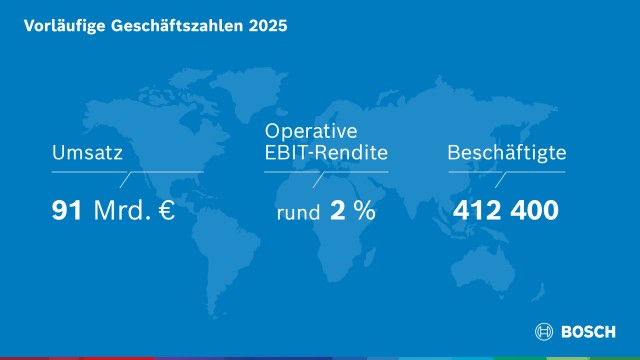 Maßgeblich für die fehlende Wachstumsdynamik im abgelaufenen Geschäftsjahr waren das schwache konjunkturelle Umfeld sowie die zunehmend anspruchsvolleren Marktbedingungen. Das Ergebnis belasteten ausbleibende Deckungsbeiträge aus fehlenden Umsätzen, gestiegene Zölle sowie erhebliche Rückstellungen für notwendige Strukturanpassungen und die damit verbundenen Personalmaßnahmen. Ziel dieser Restrukturierung ist es, das Unternehmen auch weiterhin wirtschaftlich robust, finanziell unabhängig und zukunftssicher aufzustellen. Dafür bleibt es erforderlich, ein jährliches Umsatzplus von sechs bis acht Prozent bei einer Rendite von mindestens sieben Prozent zu erwirtschaften. Vor dem Hintergrund des aktuellen Umfelds geht Bosch davon aus, anstatt 2026 frühestens von 2027 an sein Renditeziel von sieben Prozent erreichen zu können.