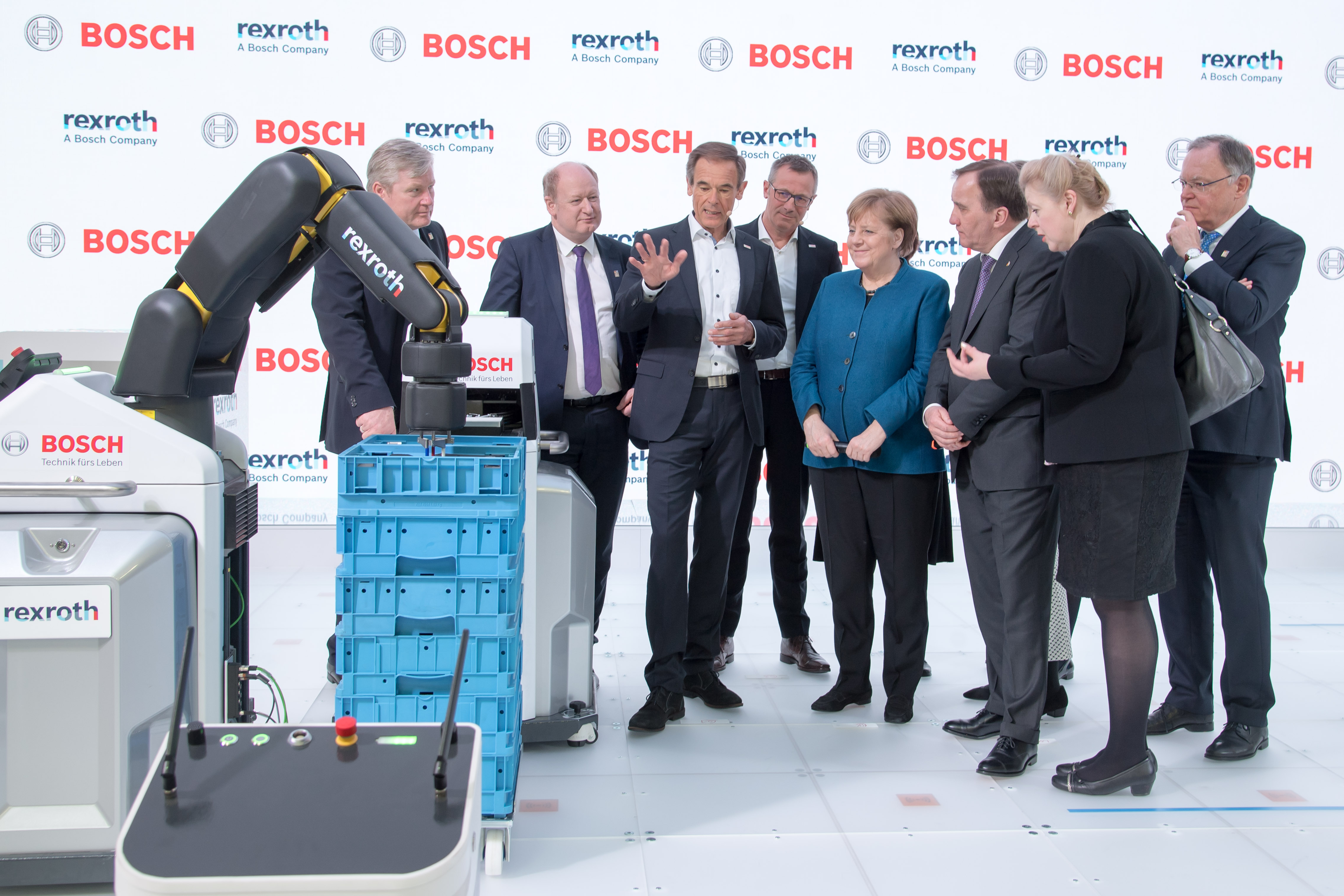 Bundeskanzlerin Angela Merkel und der schwedische Ministerpräsident Stefan Löfven besuchen den Bosch-Stand auf der Hannover Messe 2019. Im Fokus stehen autonome Transportsysteme und intelligente Robotik.