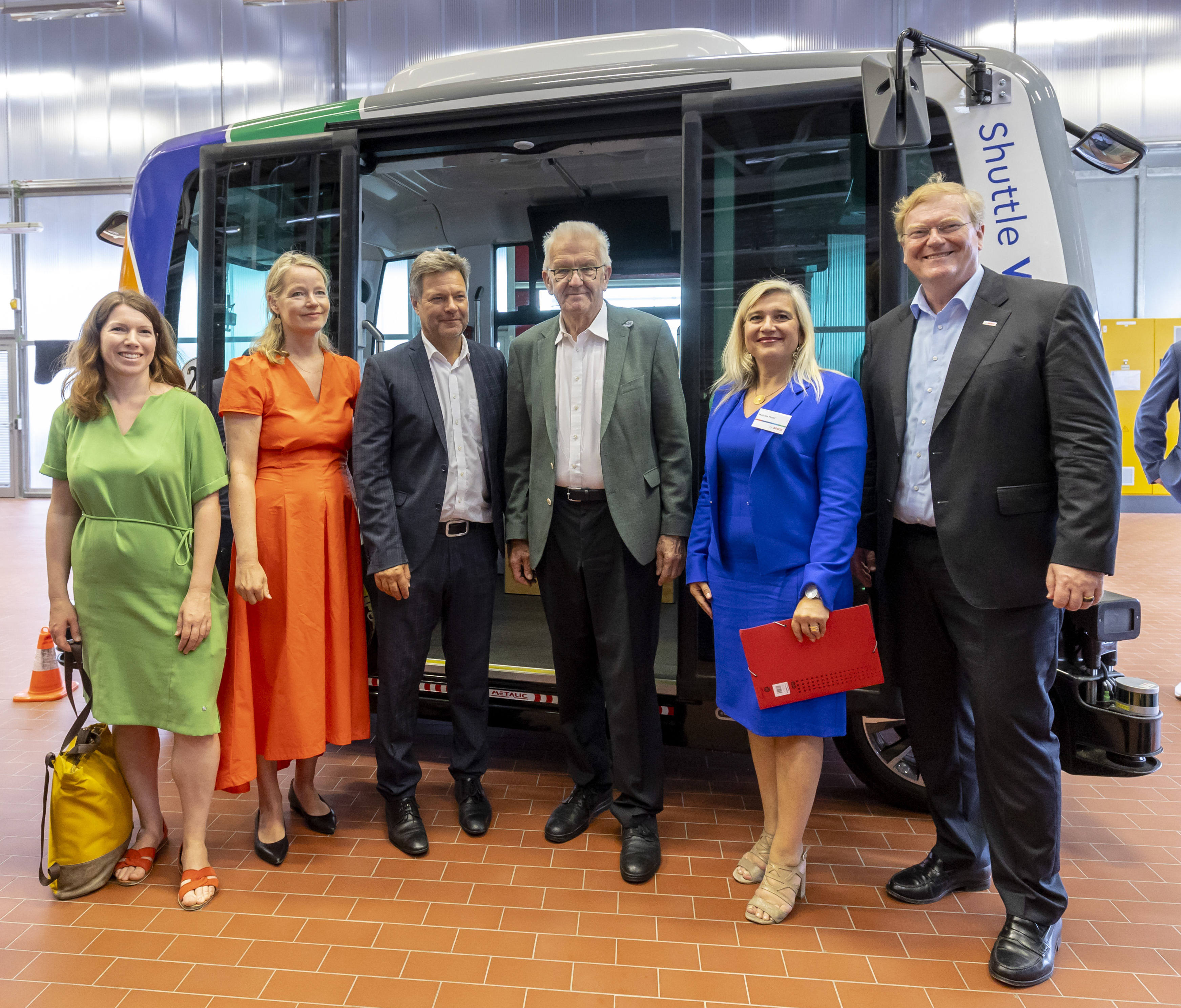 Anna Christmann (MdB), Thekla Walker (Umweltministerin Baden-Württemberg), Robert Habeck (Bundeswirtschaftsminister), Winfried Kretschmann (Ministerpräsident Baden-Württemberg), Melanie Huml (Staatsministerin Bayern), Stefan Hartung (Vorsitzender Bosch-Geschäftsführung). (von links nach rechts).