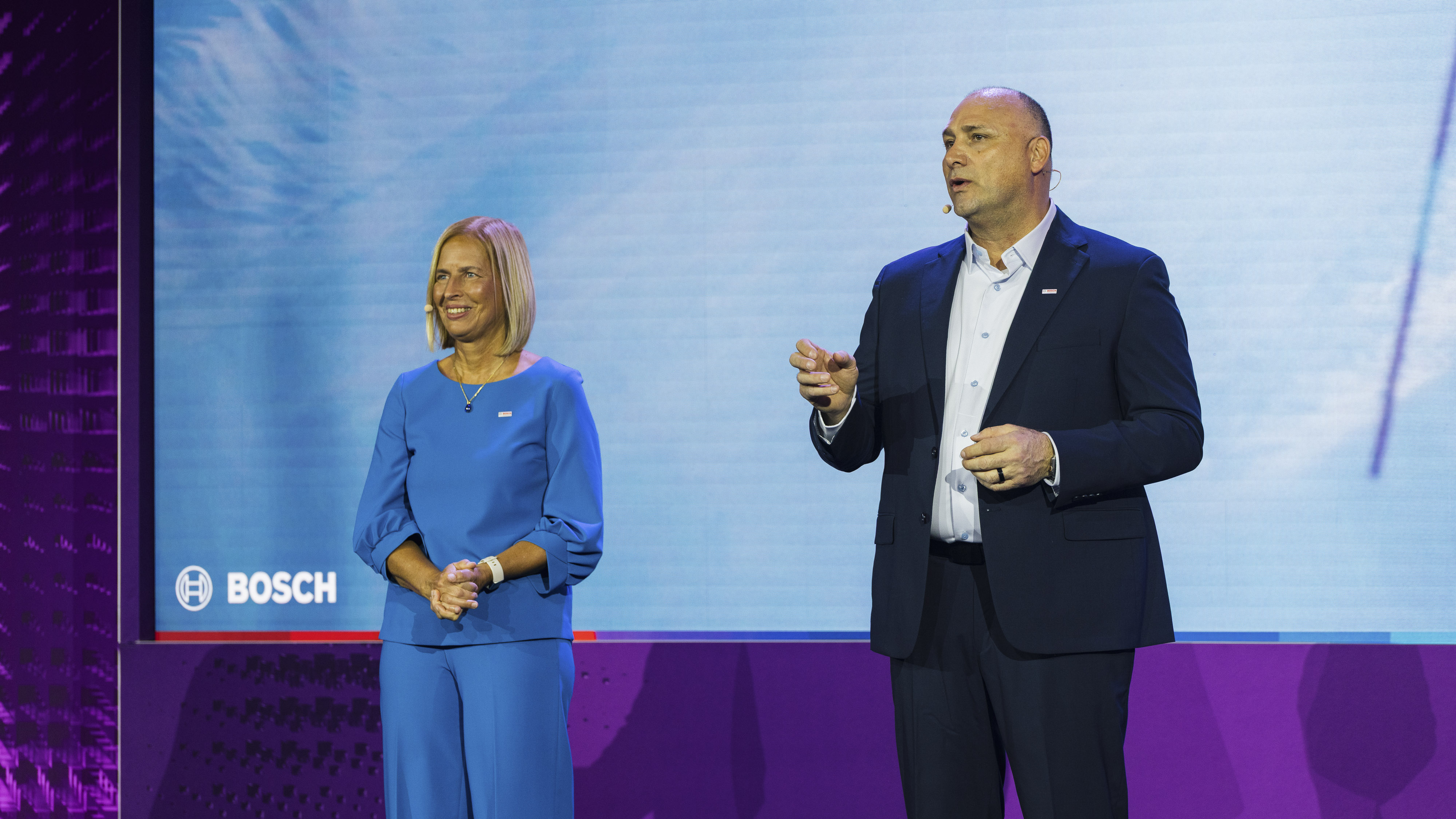 Bosch-Geschäftsführerin Tanja Rückert und Paul Thomas, Präsident von Bosch Nordamerika, auf der CES-Pressekonferenz 2026.
