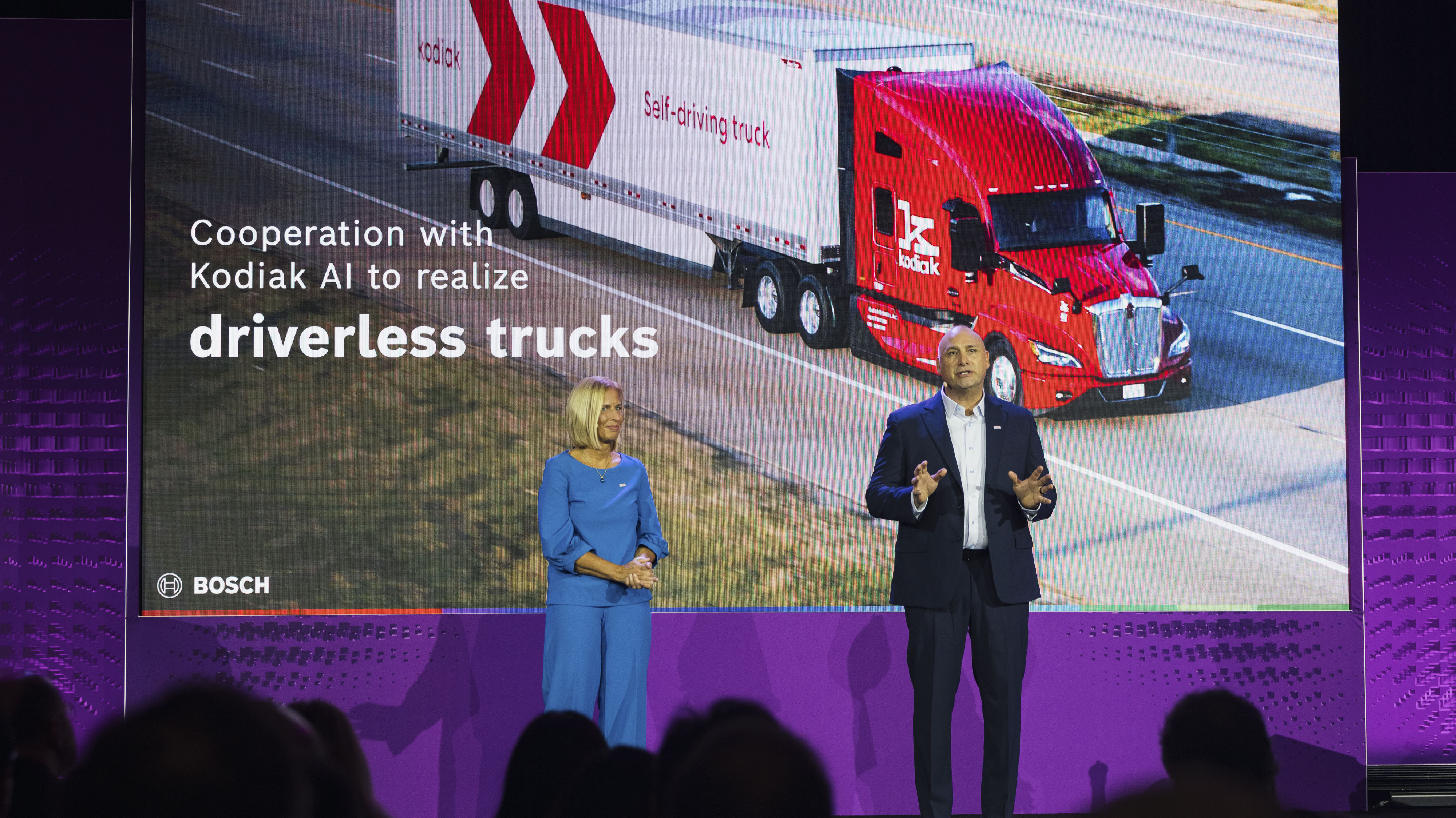 Bosch-Geschäftsführerin Tanja Rückert und Paul Thomas, Präsident von Bosch Nordamerika, auf der CES-Pressekonferenz 2026.