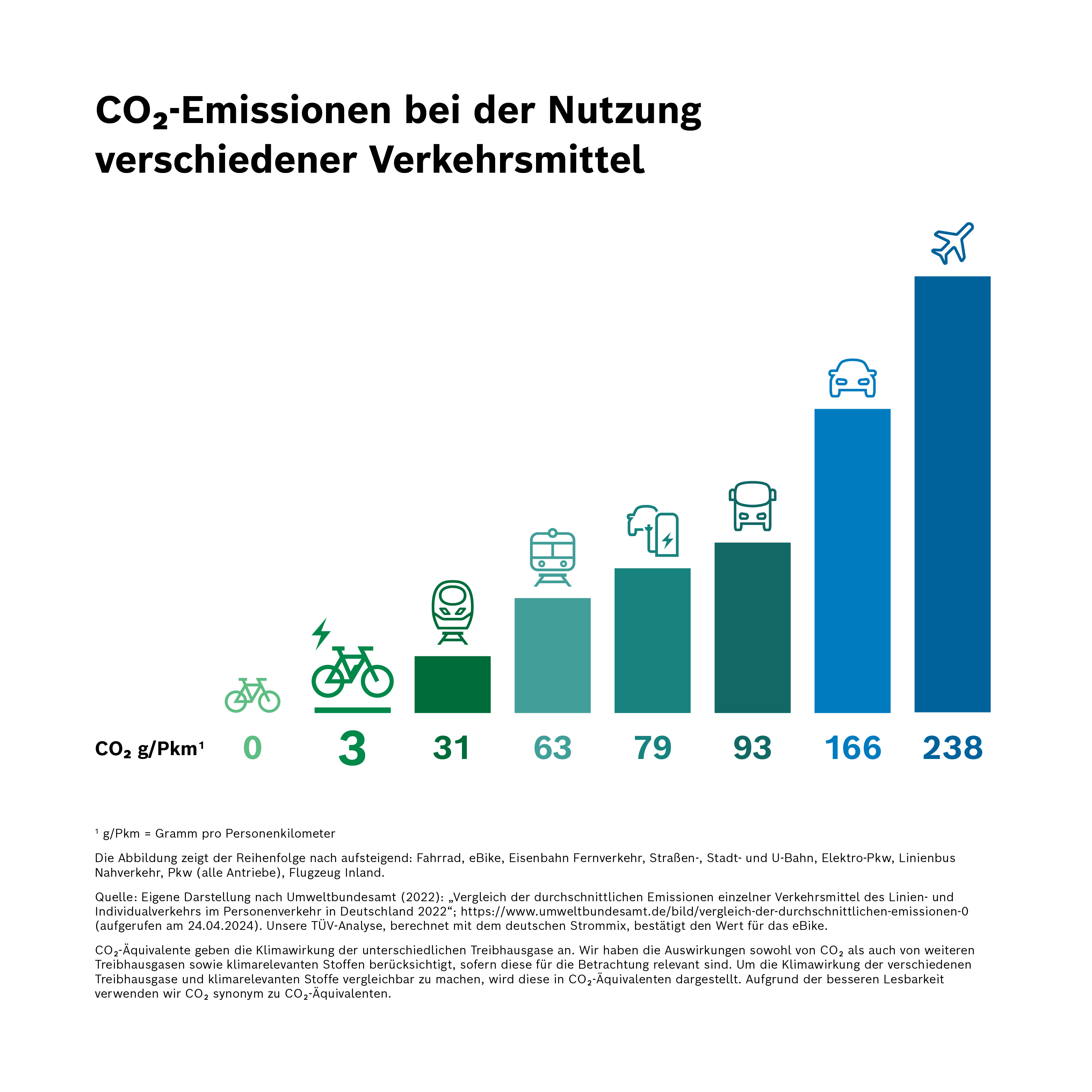 Wie eine Auswertung des Umweltbundesamts zeigt, ist das eBike eines der emissionsärmsten Verkehrsmittel. Bei der Nutzung eines eBikes ergibt sich durch den Stromverbrauch ein durchschnittlicher CO₂-Ausstoß von 3 g CO₂/Personenkilometer (Pkm), abhängig vom Strommix.