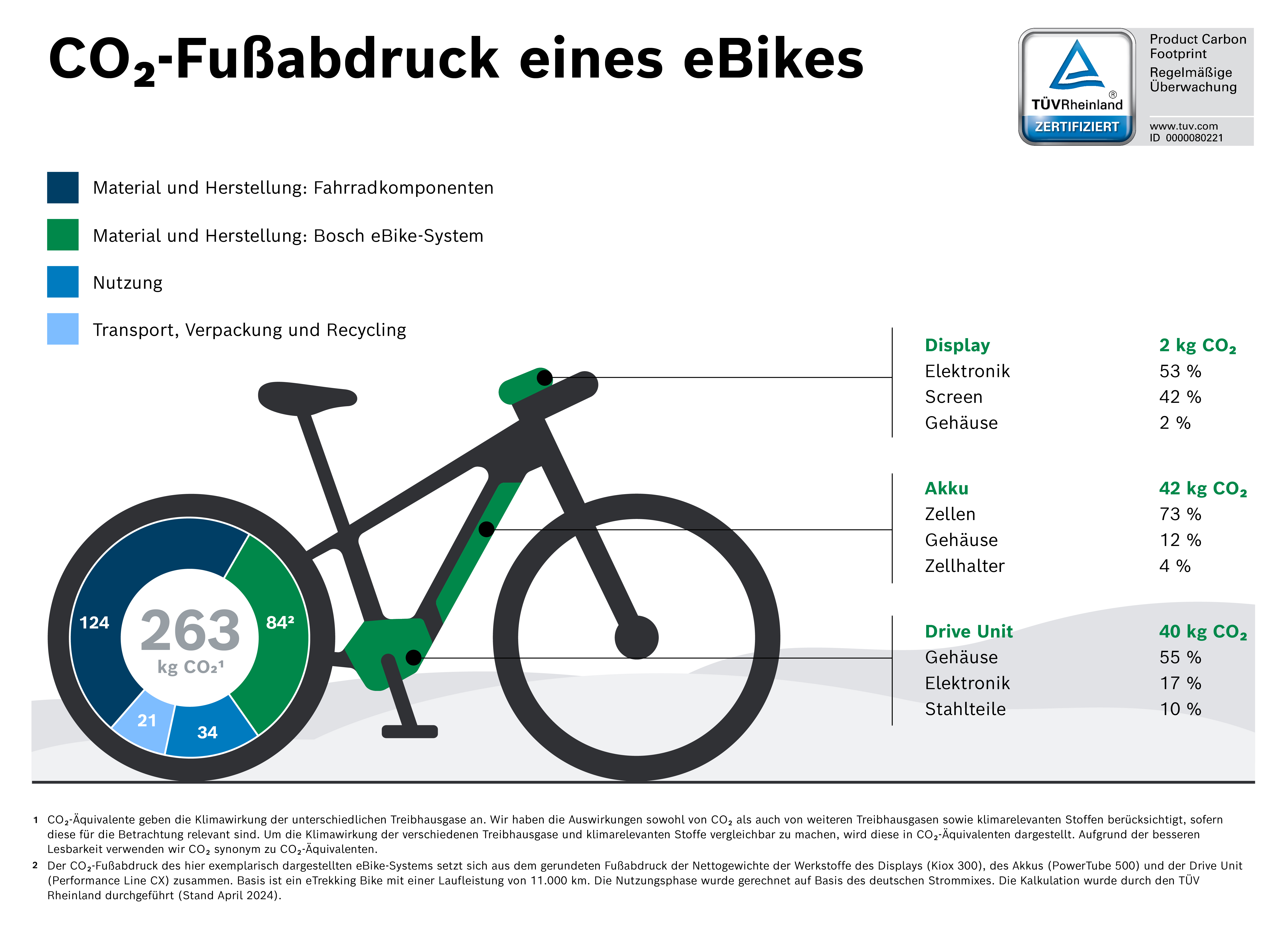 Um die Bestrebungen zur Emissionsreduktion zu intensivieren, hat Bosch eBike Systems gemeinsam mit dem TÜV Rheinland bereits 2022 eine ganzheitliche Betrachtung des CO₂-Fußabdrucks des eBikes vorgenommen und 2024 präzisiert und aktualisiert.