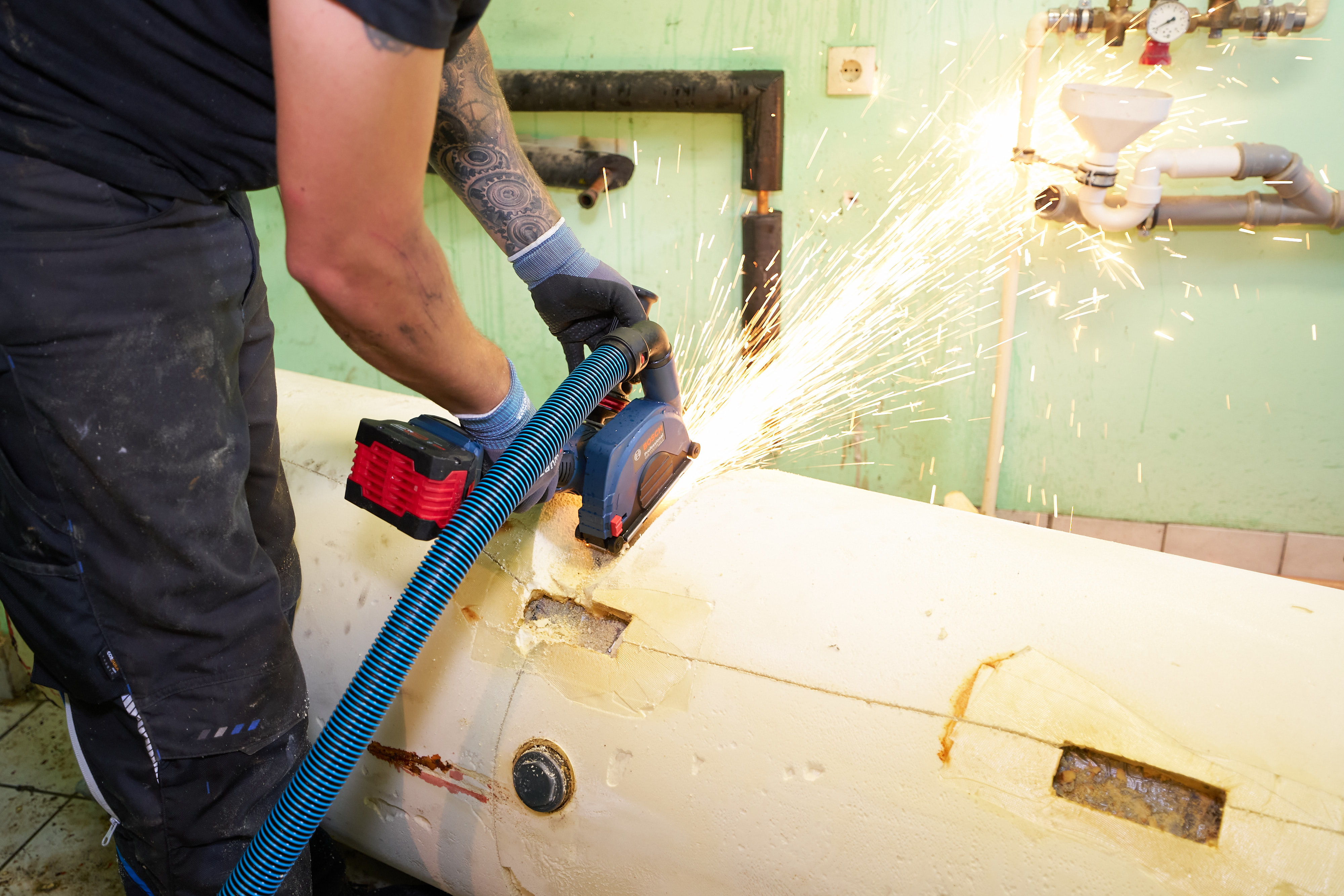 Die alte Gastherme hat Familie Rothweiler 25 Jahre lang gute Dienste geleistet. Nun weicht sie einer neuen, klimafreundlichen Luft-Wasser-Wärmepumpe von Bosch. Die Demontage der Altanlage erleichtert die Säbelsäge GSA 18V-32 von Bosch.