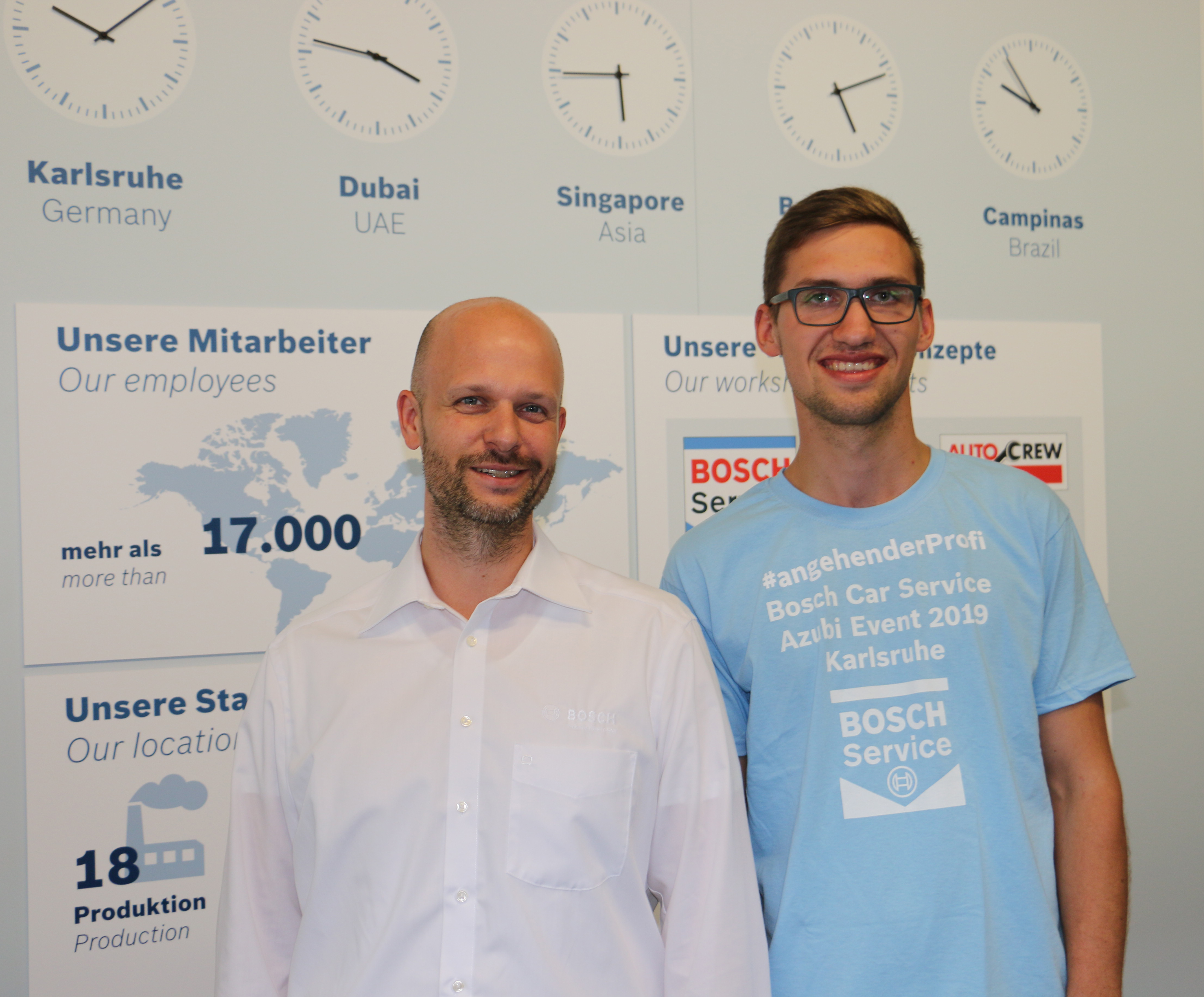 sagte Luca Oppelt (rechts), Auszubildender bei Bosch Car Service Mezger in Schweinfurt. Besonders gefiel ihm, dass er neben vielen Informationen auch Auszubildende anderer Bosch Car Service Betriebe kennengelernt hat. Dan Bronkal (lks.), Leiter Werkstattkonzepte Region Mitte bei Bosch Automotive Aftermarket, war begeistert vom regen Interesse der angehenden Profis an dieser Veranstaltung für die Auszubildenden der Bosch Car Service Partner.