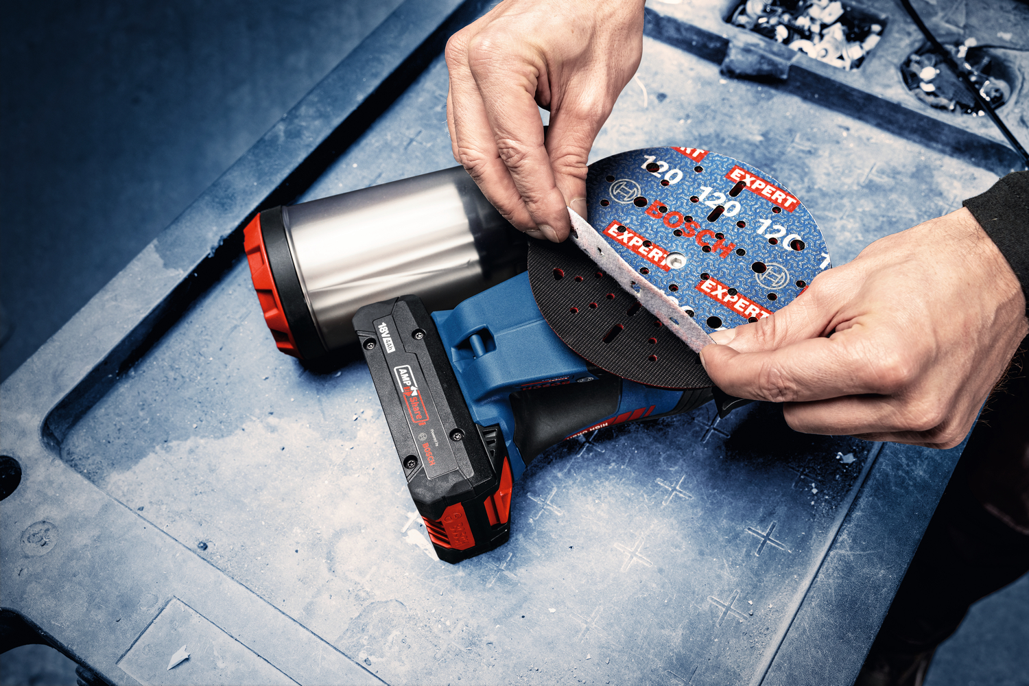 Der Multi-Loch-Schleifteller mit innovativen Venturi-Luftkanälen, einer effizienten Staubbox mit HEPA-Filter und integriertem Adapter für die Click & Clean-Schnittstelle, gewährleistet eine erstklassige Staubkontrolle. Die Schleiffolie kann mit Hilfe der Symmetrielinie passgenau auf Teller aufgebracht werden.