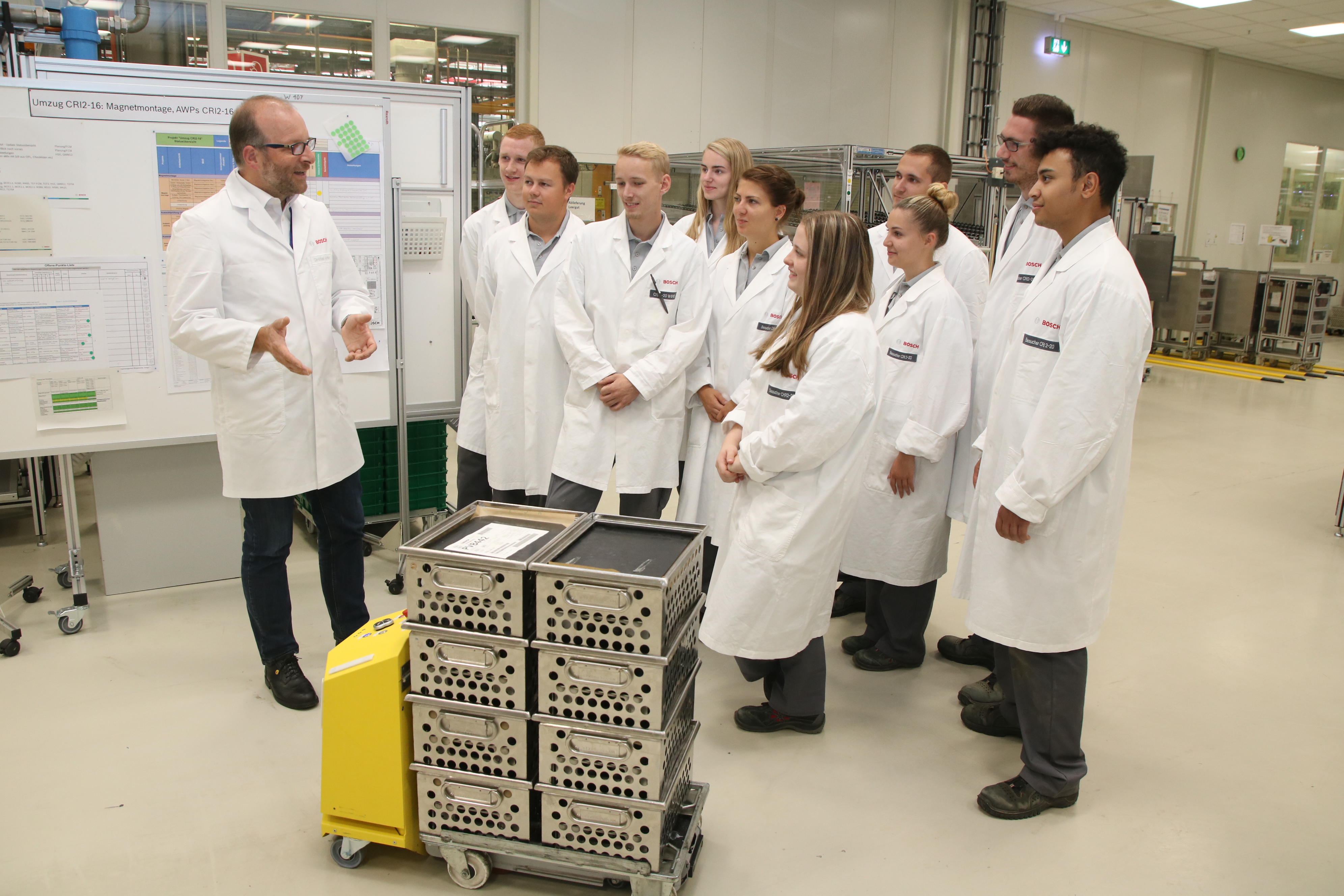 Im Rahmen ihrer technisch-gewerblichen Ausbildung übernehmen die jungen Azubis in Homburg die Rolle als „Botschafter für Industrie 4.0“. Als Industrie 4.0-Botschafter vermitteln sie mit Unterstützung ihrer Ausbilder grundlegendes Digitalwissen an acht Partnerschulen des Standorts. Auf diese Weise bekommen die Schüler einen praktischen Einblick in die verschiedenen Berufsbilder. Bild: Auszubildende der technisch-gewerblichen Ausbildung am Bosch Standort Homburg mit Schulungsleiter Uwe Thies Trapp, Referent für Industrie 4.0 und Digitale Transformation.