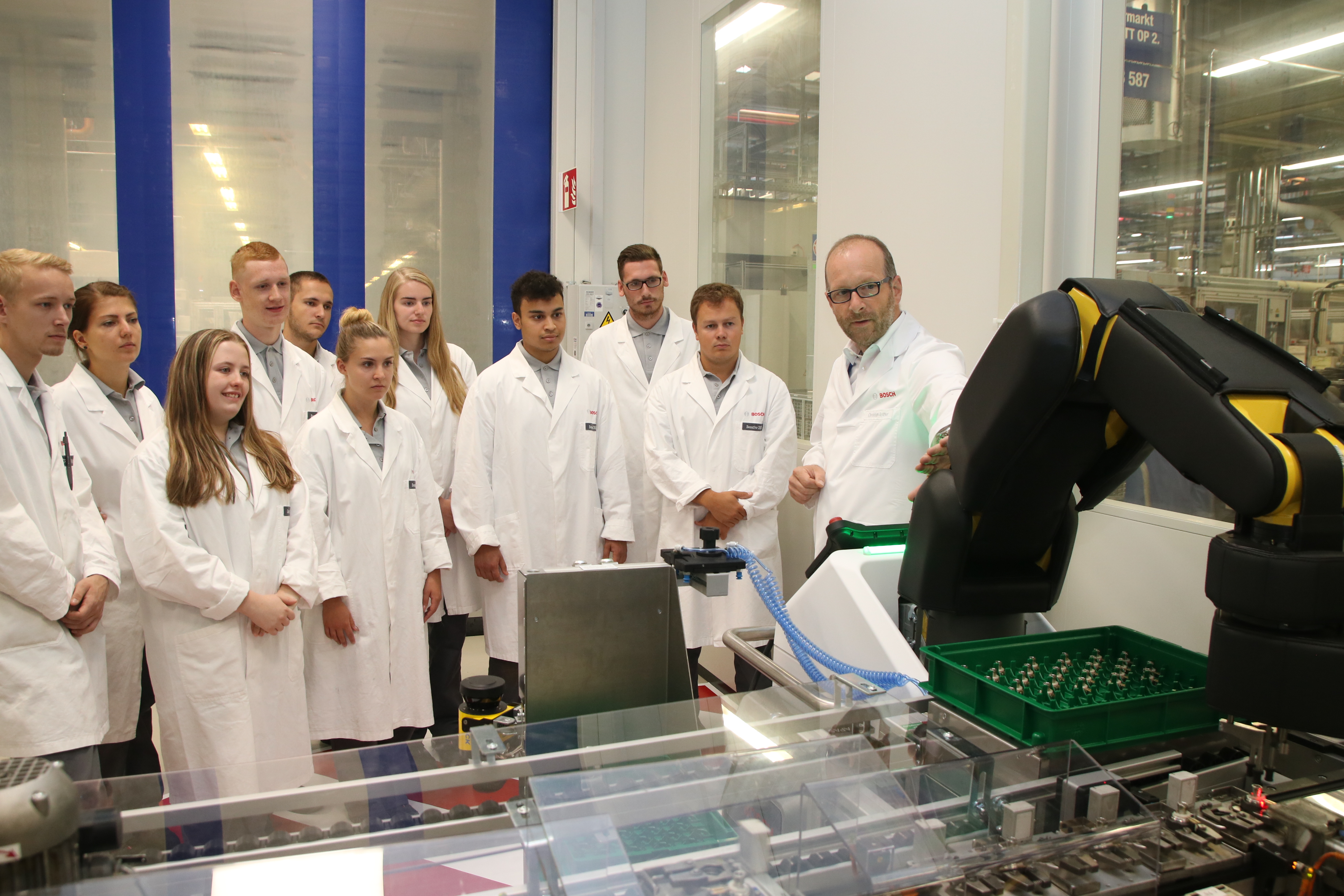 Im Rahmen ihrer technisch-gewerblichen Ausbildung übernehmen die jungen Azubis in Homburg die Rolle als „Botschafter für Industrie 4.0“. Als Industrie 4.0-Botschafter vermitteln sie mit Unterstützung ihrer Ausbilder grundlegendes Digitalwissen an acht Partnerschulen des Standorts. Auf diese Weise bekommen die Schüler einen praktischen Einblick in die verschiedenen Berufsbilder. Bild: Auszubildende der technisch-gewerblichen Ausbildung am Bosch Standort Homburg mit Schulungsleiter Uwe Thies Trapp, Referent für Industrie 4.0 und Digitale Transformation.