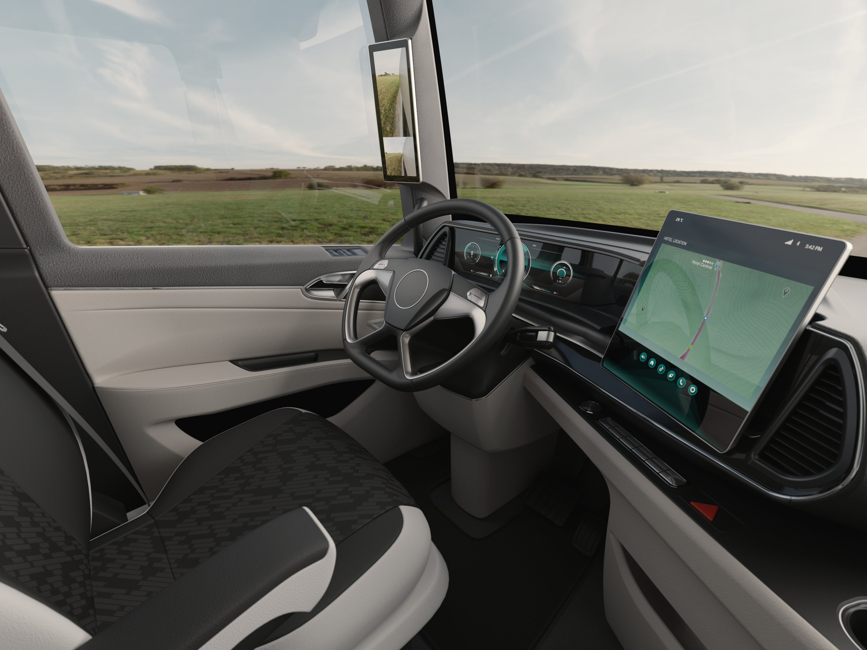 Zusammen mit Mekra Lang hat Bosch das Digital Vision System entwickelt, das die großen Außenspiegel durch zwei innenliegende Monitore sowie zwei Außenkameras ersetzt, die außerhalb der Fahrerkabine montiert werden.