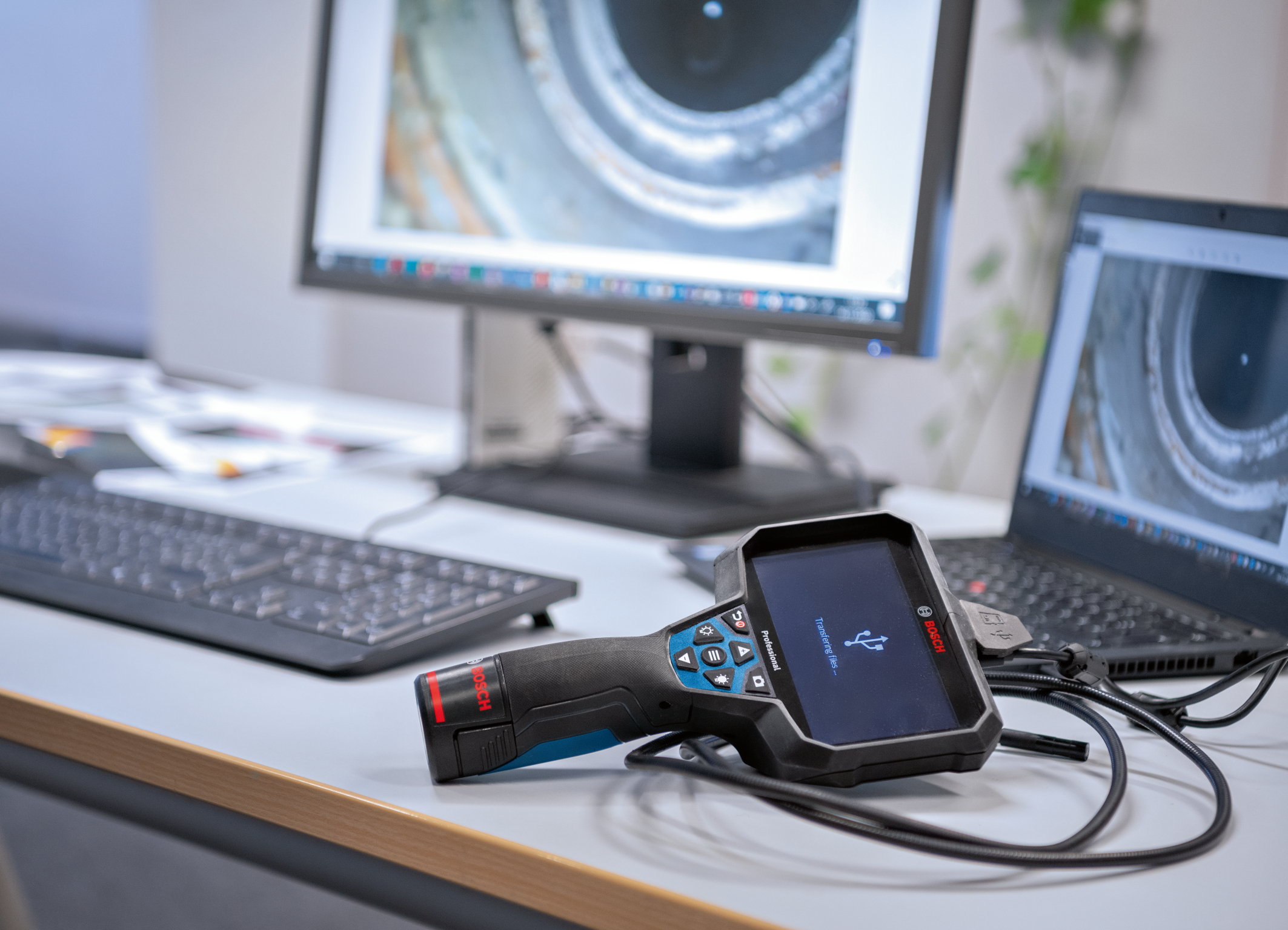 Der Zustand von Rohren, Schächten, verlegten Kabeln oder auch des Motorraums lässt sich mithilfe von Bildern der Inspektionskameras GIC 12V-5-27 C Professional (im Bild) und GIC 12V-4-23 C Professional genau dokumentieren. Auf dem internen Kameraspeicher ist Platz für jeweils 30 Bilder mit einer Auflösung von 1280 x 720 Pixeln. Die GIC 12V-5-27 C Professional bietet bei eingesetzter Micro-SD-Karte zusätzlichen Speicherplatz für Bilder und darüber hinaus auch für ganze Inspektionsvideos. Ansehen lassen sich Fotos und Videos direkt auf dem Bildschirm der Kamera oder nach dem Herunterladen via USB-C®-Kabel auf dem PC.