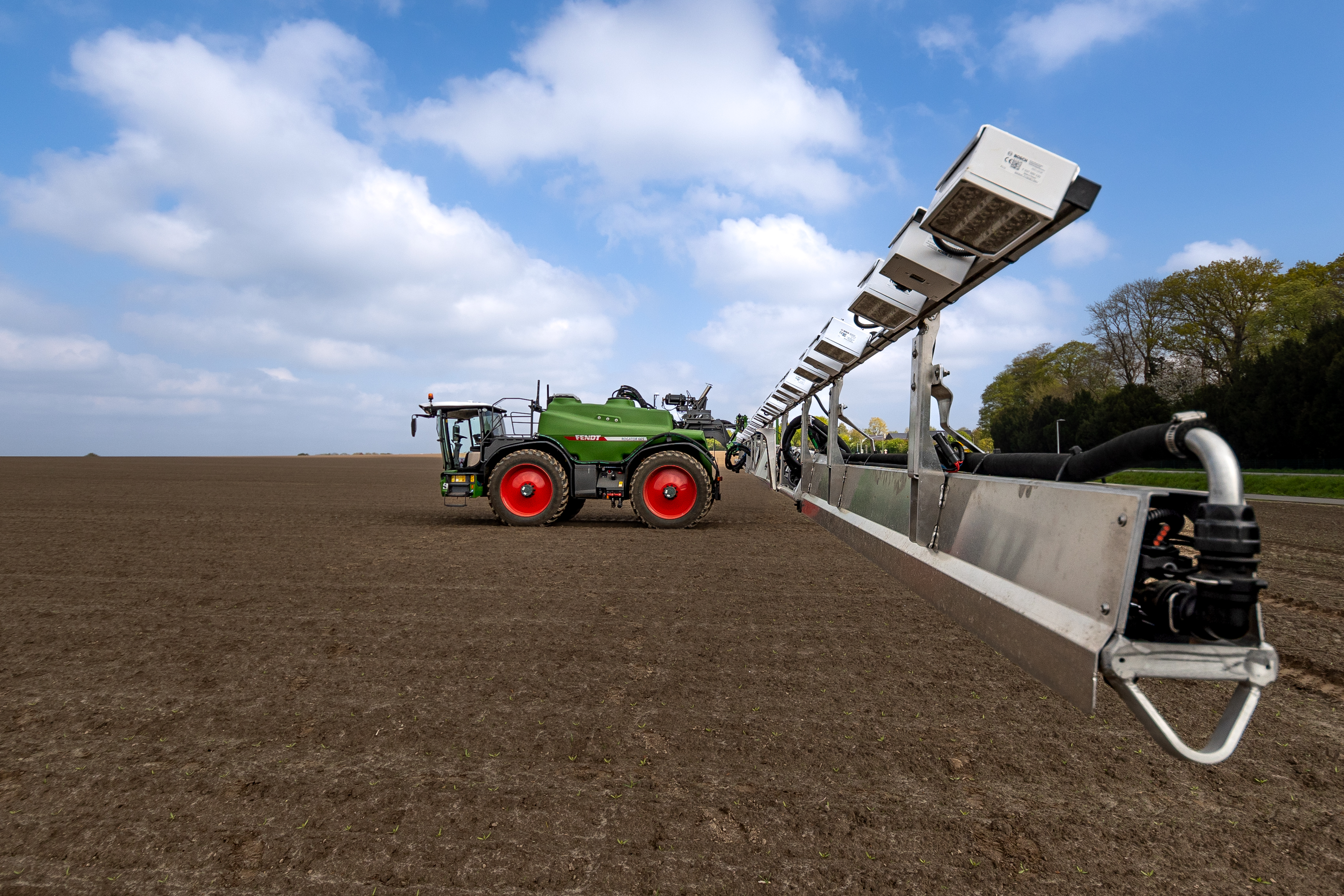 Eine Fendt Rogator Feldspritze, die mit der Smart-Spraying-Lösung von Bosch BASF Smart Farming ausgestattet ist.