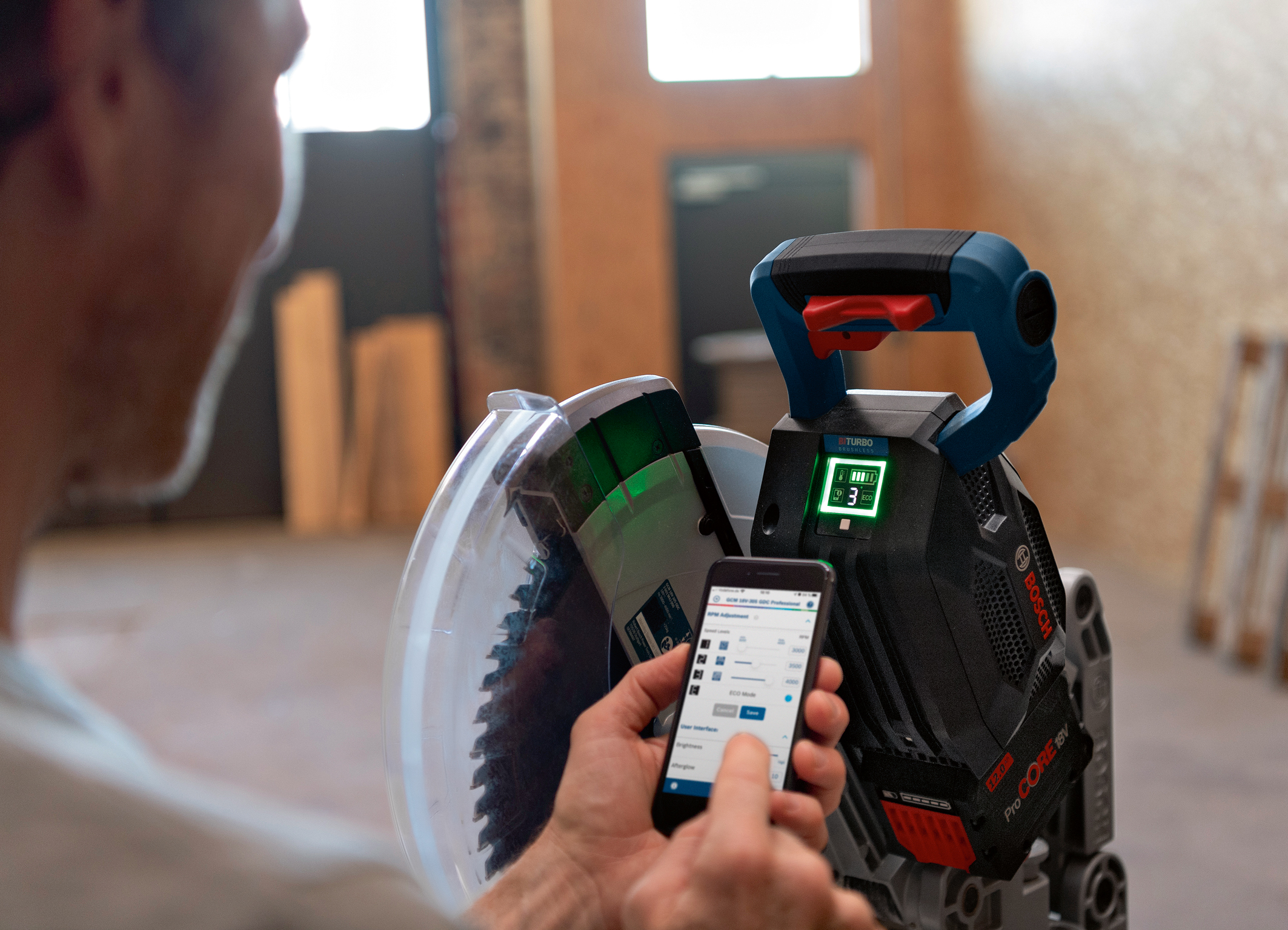 Die GCM 18V-305 GDC Professional ist die erste Bosch Akku-Kapp- und Gehrungssäge im Markt, die mit User Interface ‒ einem interaktiven Display ‒ sowie Connectivity ausgestattet ist. Dadurch haben Handwerker den Werkzeug- und Akku-Status jederzeit im Blick. Darüber hinaus können sie mit dem „Eco Modus“ bis zu 20 Prozent mehr Schnitte pro Akku-Ladung machen bei leichten Anwendungen wie dem Ablängen von Weichholz und Leisten, oder die Schnittgeschwindigkeit an die jeweilige Anwendung anpassen. Dadurch ist die Säge bequemer zu handhaben als bisherige Modelle.