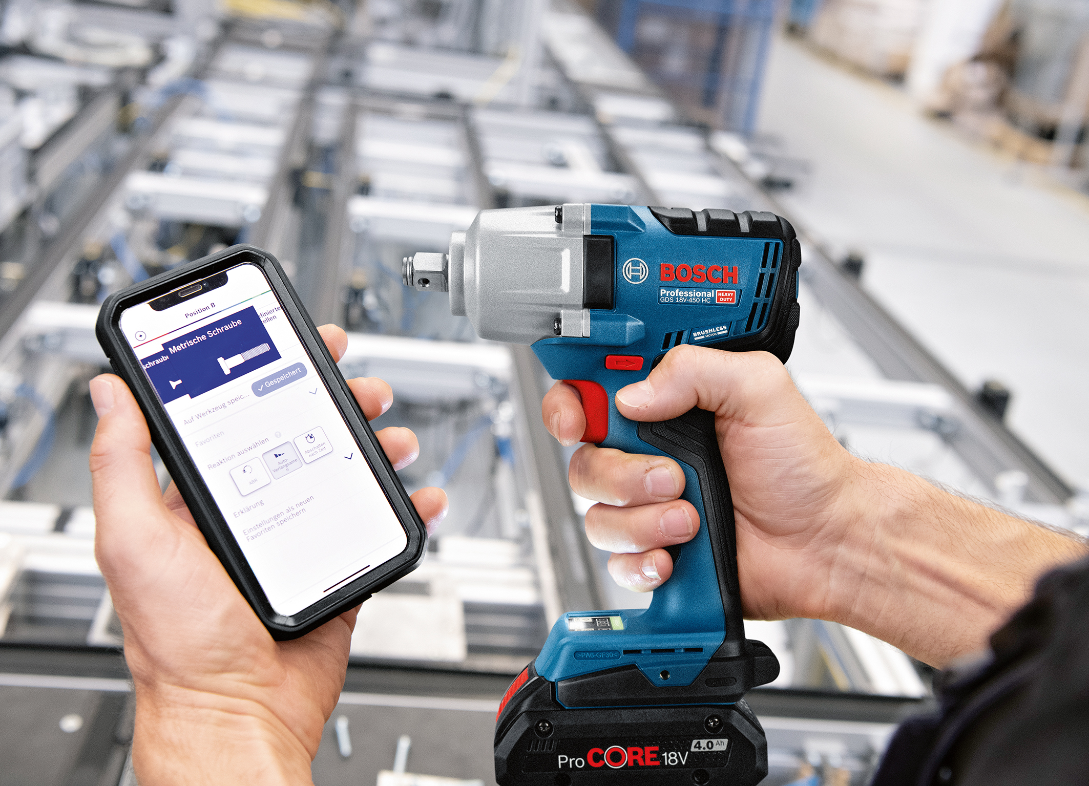 Der GDS 18V-450 HC Professional von Bosch ist ein leistungsstarker Akku-Drehschlagschrauber mit Connectivity-Funktionen. Er bietet zwei Schraub-Modi, die per App weiter konfiguriert werden können. Die Position A, der erste Modus, ist für Metallschrauben voreingestellt und beinhaltet Funktionen wie „Abschalten nach Zeit“ und ABR (Auto Bolt Release). Sie greifen beim Festziehen beziehungsweise Lösen von Schrauben und Muttern und sorgen dafür, dass diese weder überdreht werden noch bei der Demontage verlorengehen. Die Position B ist für Holzschrauben. Beide vordefinierten Modi können per Bosch Toolbox App weiter individualisiert und für spätere Anwendungen gespeichert werden. Dadurch sparen sich Profis bei wiederkehrenden Serienverschraubungen Zeit und stellen das Gerät immer optimal auf die jeweilige Anwendung ein.