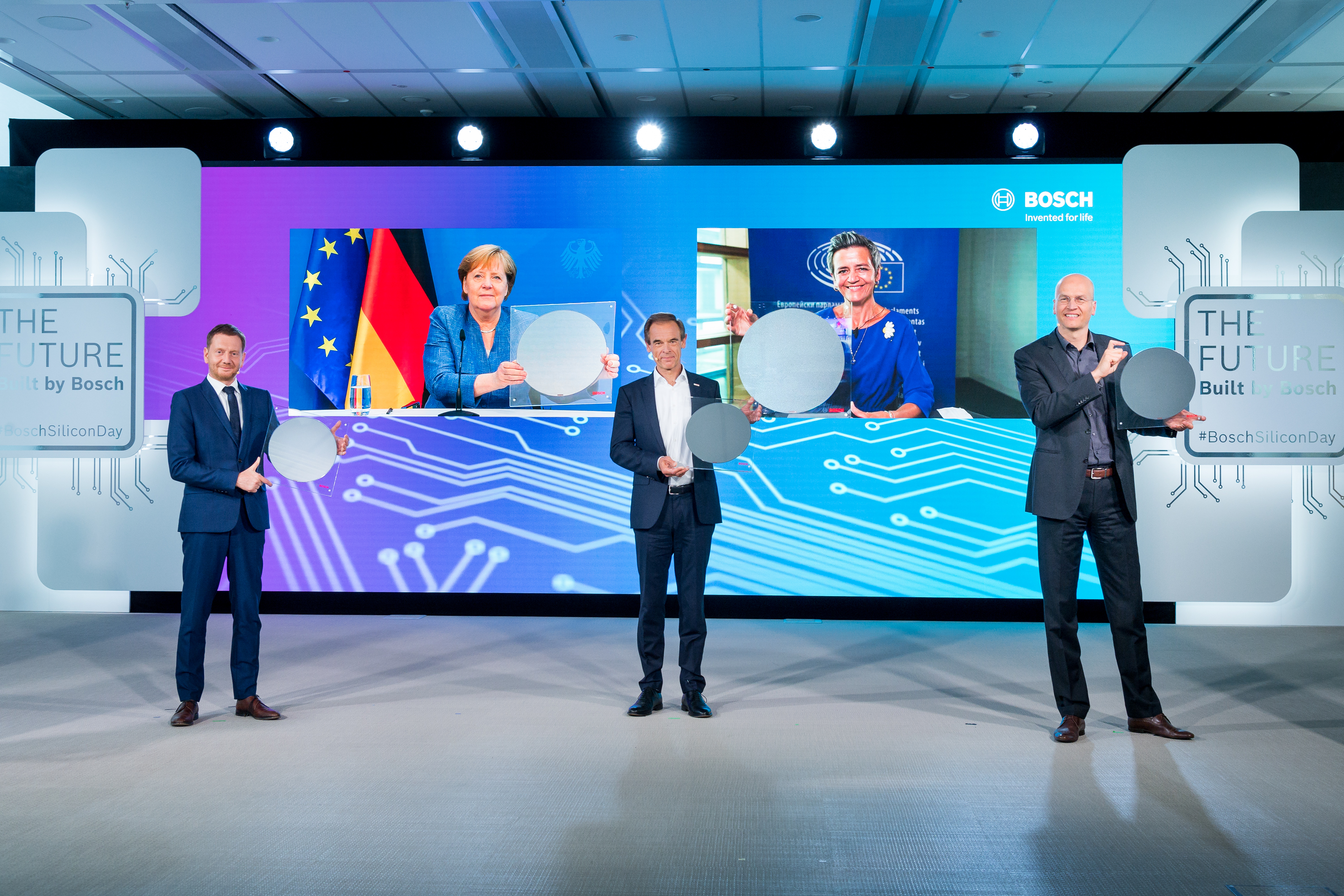 Im virtuellen Beisein von Bundeskanzlerin Dr. Angela Merkel, Vizepräsidentin der EU-Kommission Margrethe Vestager sowie in Anwesenheit von Ministerpräsident Michael Kretschmer eröffnete Bosch am 07. Juni 2021 feierlich sein neues 300-Millimeter-Halbleiterwerk in Dresden. Auf dem Bild von links nach rechts: Michael Kretschmer, Ministerpräsident des Freistaates Sachsen; Dr. Angela Merkel, Bundeskanzlerin der Bundesrepublik Deutschland; Dr. Volkmar Denner, Vorsitzender der Geschäftsführung der Robert Bosch GmbH; Margrethe Vestager, Vizepräsidentin der EU-Kommission; Harald Kröger, Geschäftsführer der Robert Bosch GmbH.