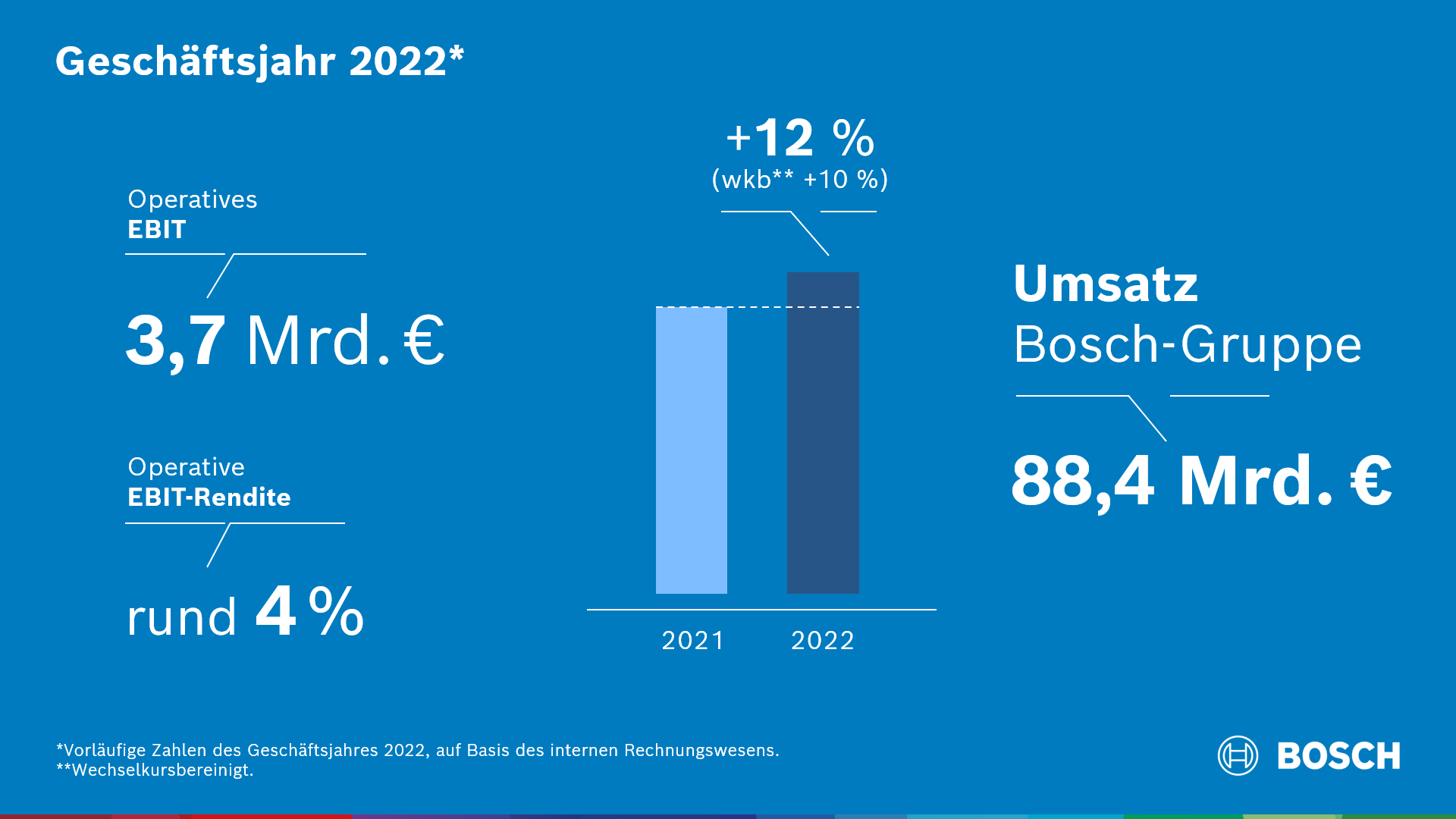 Das Technologie- und Dienstleistungsunternehmen Bosch hat im Geschäftsjahr 2022 trotz anspruchsvoller gesamtwirtschaftlicher Lage Umsatz und Ergebnis gesteigert. Nach vorläufigen Zahlen erwirtschaftete die Bosch-Gruppe einen Gesamterlös von 88,4 Milliarden Euro. Der Umsatz stieg damit um gut 12 Prozent gegenüber dem Vorjahr, wechselkursbereinigt um etwa zehn Prozent. Das operative Ergebnis vor Finanzergebnis und Steuern (EBIT) erreichte 3,7 Milliarden Euro. Die operative EBIT-Rendite beläuft sich voraussichtlich auf rund vier Prozent.