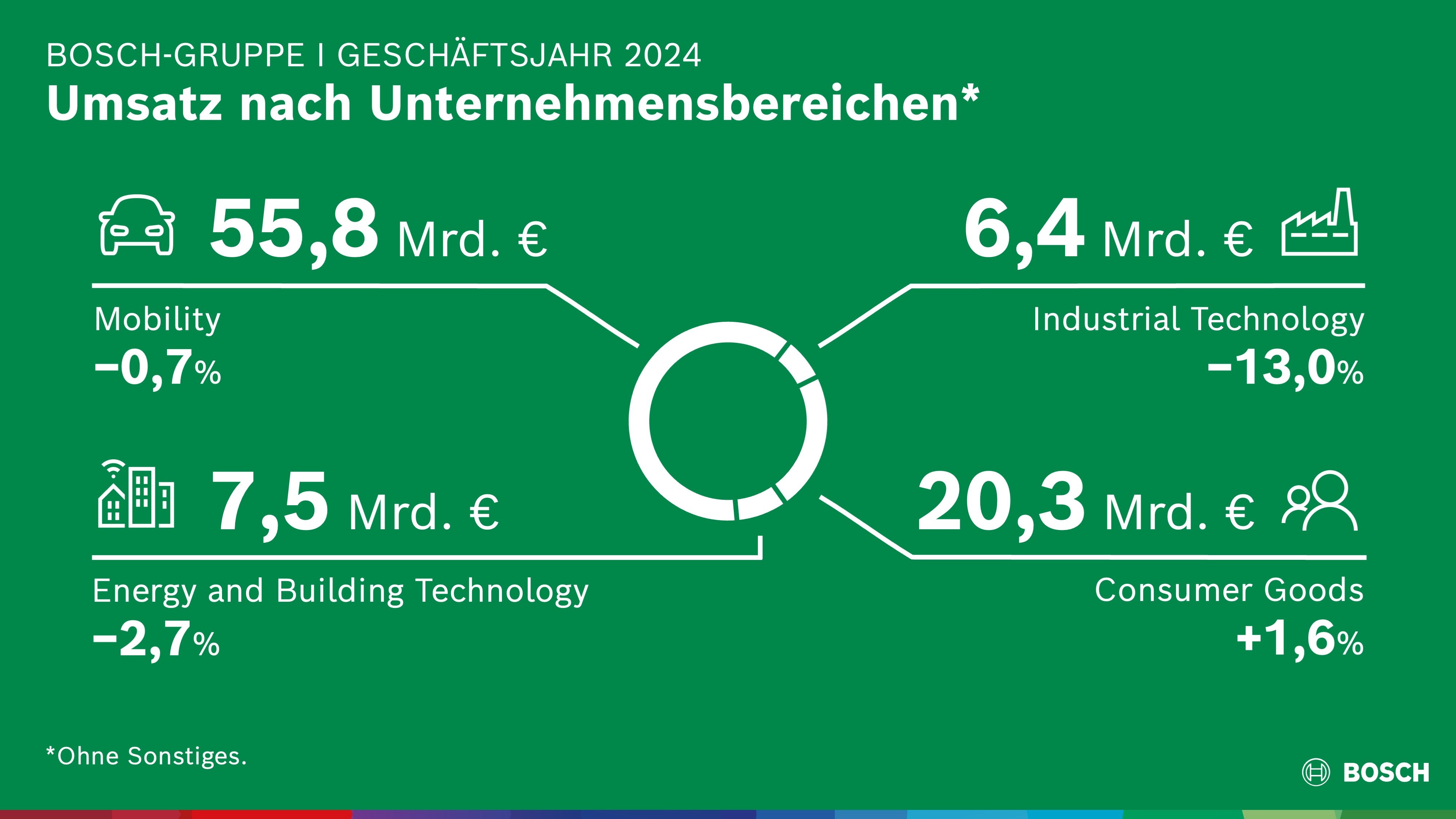 Die Bosch-Gruppe setzt ihre ambitionierte Strategie 2030 zur Stärkung der Wettbewerbsposition fort, auch wenn das Marktumfeld das Wachstum im vergangenen Jahr deutlich bremste: Mit 90,3 Milliarden Euro erwirtschaftete das Technologie- und Dienstleistungsunternehmen 2024 1,4 Prozent weniger Umsatz als im Vorjahr. Im Unternehmensbereich Mobility lag der Umsatz mit 55,8 Milliarden Euro um 0,7 Prozent unter dem Vorjahreswert. Der Unternehmensbereich Industrial Technology erzielte Erlöse von 6,4 Milliarden Euro. Das ist ein Minus von 13,0 Prozent. Der Unternehmensbereich Consumer Goods konnte seinen Umsatz um 1,6 Prozent auf 20,3 Milliarden Euro steigern. Im Unternehmensbereich Energy and Building Technology fiel der Umsatz mit 7,5 Milliarden Euro um 2,7 Prozent geringer aus als im Vorjahr.