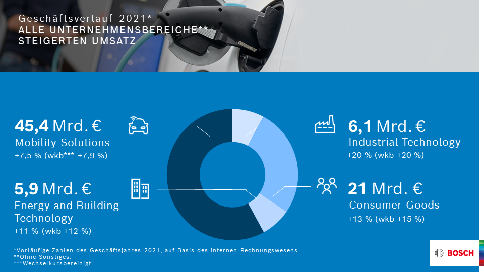 Die Bosch-Gruppe steigerte ihren Gesamtumsatz im Geschäftsjahr 2021 nach vorläufigen Zahlen nicht nur gegenüber dem Vorjahr, sondern lag damit auch über dem Vorkrisenniveau von 2019. Alle Unternehmensbereiche haben trotz weltweiter Lieferengpässe ihre Erlöse gesteigert. Der umsatzstärkste Unternehmensbereich Mobility Solutions legte deutlich zu. Der Umsatz stieg um 7,5 Prozent auf 45,4 Milliarden Euro. Das ist ein wechselkursbereinigtes Plus von 7,9 Prozent. Der Unternehmensbereich Industrial Technology erwirtschaftete einen Umsatz von 6,1 Milliarden Euro. Der Anstieg lag nominal als auch wechselkursbereinigt bei 20 Prozent. Im Unternehmensbereich Consumer Goods erreichte der Umsatz 21 Milliarden Euro. Der Anstieg von 13 Prozent ist wechselkursbereinigt ein Plus von 15 Prozent. Im Unternehmensbereich Energy and Building Technology legten die Erlöse um 11 Prozent auf 5,9 Milliarden Euro zu; wechselkursbereinigt ist das ein Wachstum von 12 Prozent.