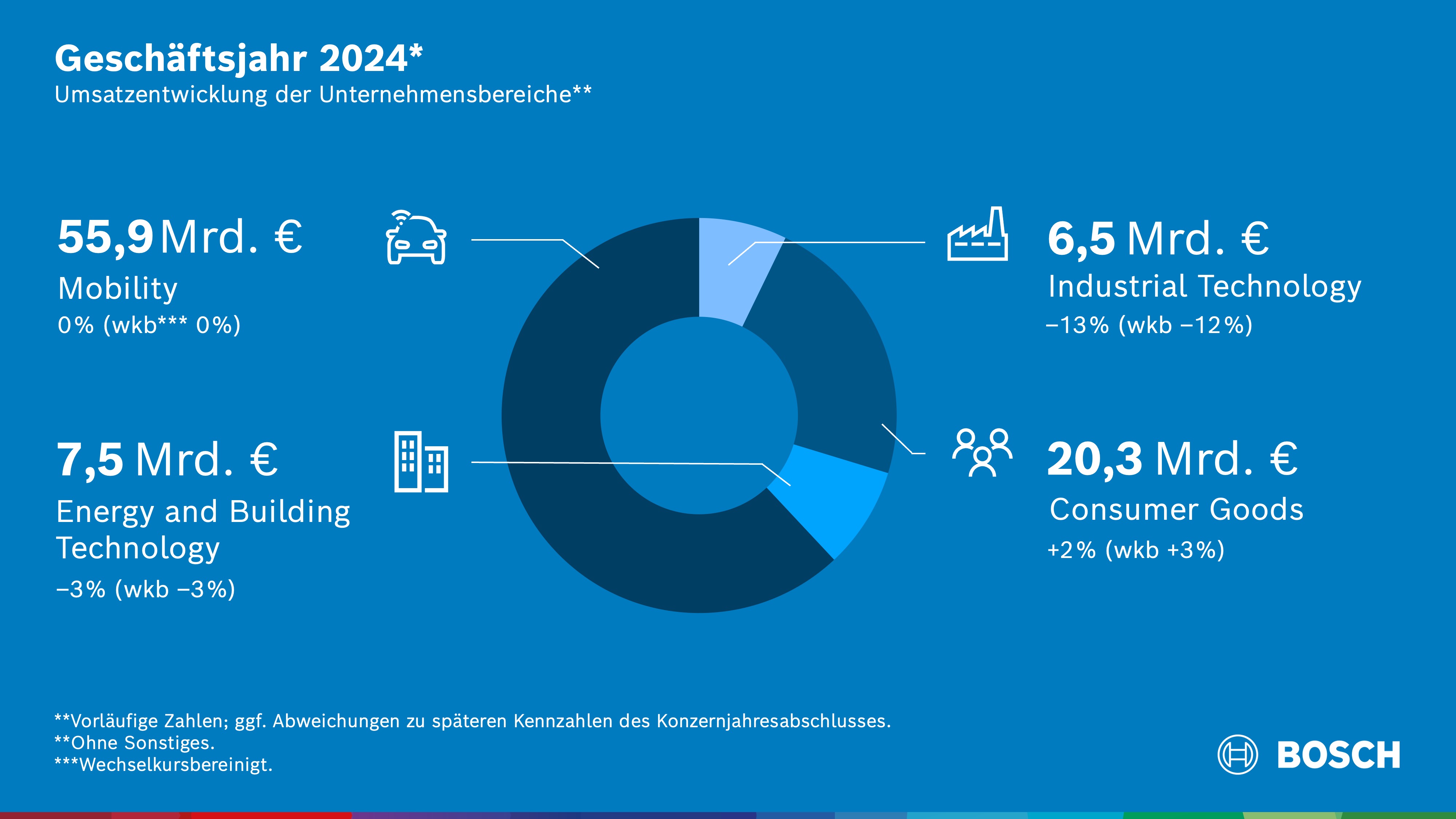 Das Technologie- und Dienstleistungsunternehmen Bosch erreichte im Geschäftsjahr 2024 nach vorläufigen Zahlen einen Umsatz von 90,5 Milliarden Euro. Die Erlöse liegen nominal um ein Prozent unter Vorjahr, wechselkursbereinigt auf Vorjahreshöhe. Die operative EBIT-Rendite liegt bei 3,5 Prozent. Auf die Geschäftsentwicklung wirkten sich neben dem schwachen Wachstum der Weltwirtschaft auch erhebliche Marktverzögerungen in Wachstumsfeldern wie der Elektromobilität ungünstig aus. Der Unternehmensbereich Mobility erzielte mit einem Umsatz von 55,9 Milliarden Euro in etwa das Vorjahresniveau. Trotz des rückläufigen Marktes blieben die Erlöse auch wechselkursbereinigt nahezu unverändert. Im Unternehmensbereich Industrial Technology erreichte der Umsatz 6,5 Milliarden Euro. Das sind nominal 13 Prozent weniger als im Vorjahr, wechselkursbereinigt minus zwölf Prozent. Im Unternehmensbereich Consumer Goods stiegen die Erlöse nominal um zwei Prozent auf 20,3 Milliarden Euro. Wechselkursbereinigt lagen sie sogar drei Prozent über dem Vorjahr. Im Unternehmensbereich Energy and Building Technology erreichten die Erlöse 7,5 Milliarden Euro. Nominal und wechselkursbereinigt lag der Umsatzrückgang bei drei Prozent.