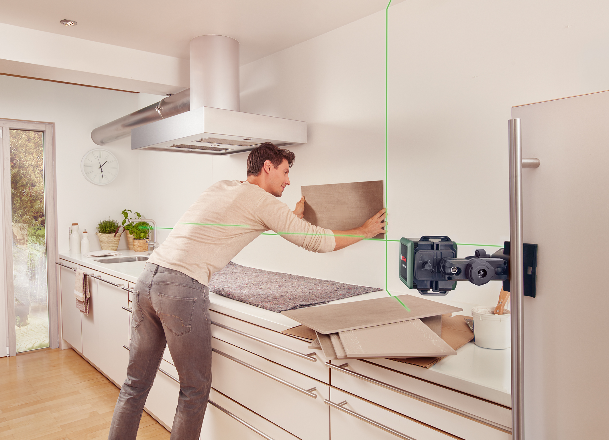 Der neue Quigo Green deckt mit einer Reichweite von bis zu zwölf Metern und Neigungsfunktion ein breites Anwendungsspektrum ab. Bilder oder Gardinenstangen richtig positionieren, Küchen- und Badschränke auf eine Ebene bringen, Wände mit Fliesen oder Mustertapeten gestalten ‒ der Quigo Green liefert dabei jetzt dank höherer Genauigkeit von ± 0,6 Millimetern pro Meter noch präzisere Ergebnisse. Er kann mit der Universalklemme MM2 einfach an Tischplatten, Leitern, Regalen oder auch Treppengeländern befestigt werden. Besonders einfach geht das mit Hilfe der Adapterplatte, die zusätzlich über eine Feinjustierung von ± 2 Zentimetern verfügt – häufiges Neuausrichten ist so überflüssig.