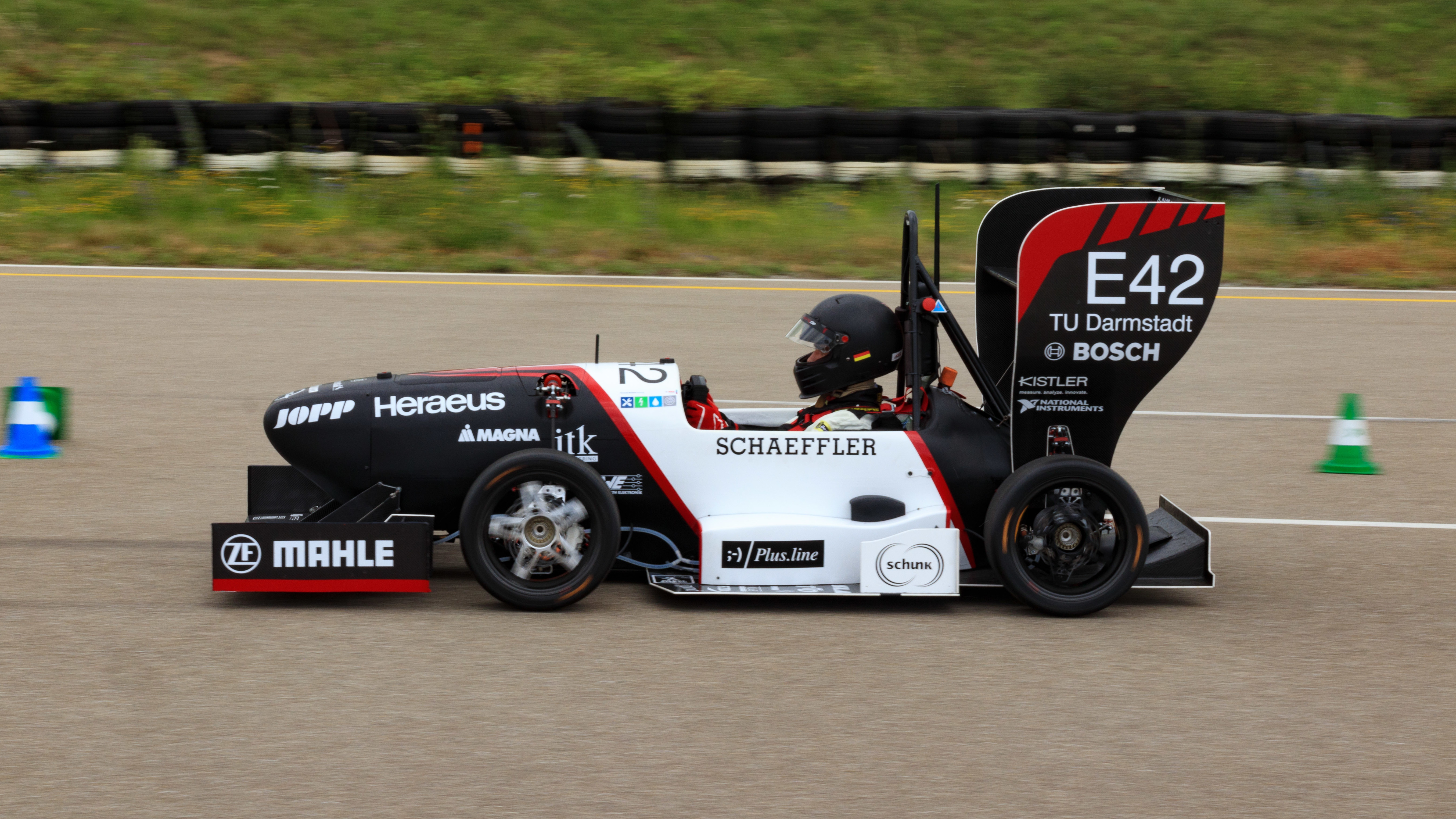Das Team der TU Darmstadt testet sein Electric Fahrzeug auf der Bosch-Teststrecke in Boxberg.