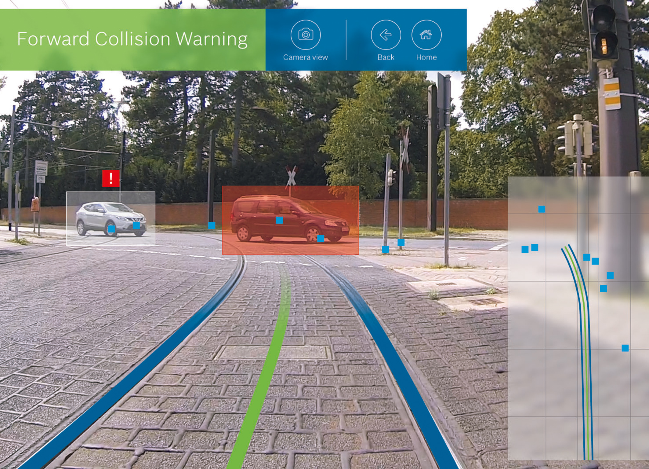 Das Kollisionswarnsystem erfasst mit einem Radar- und Videosensor Fahrzeuge, Busse, benachbarte Schienenfahrzeuge und feststehende Hindernisse auf dem Schienenweg.