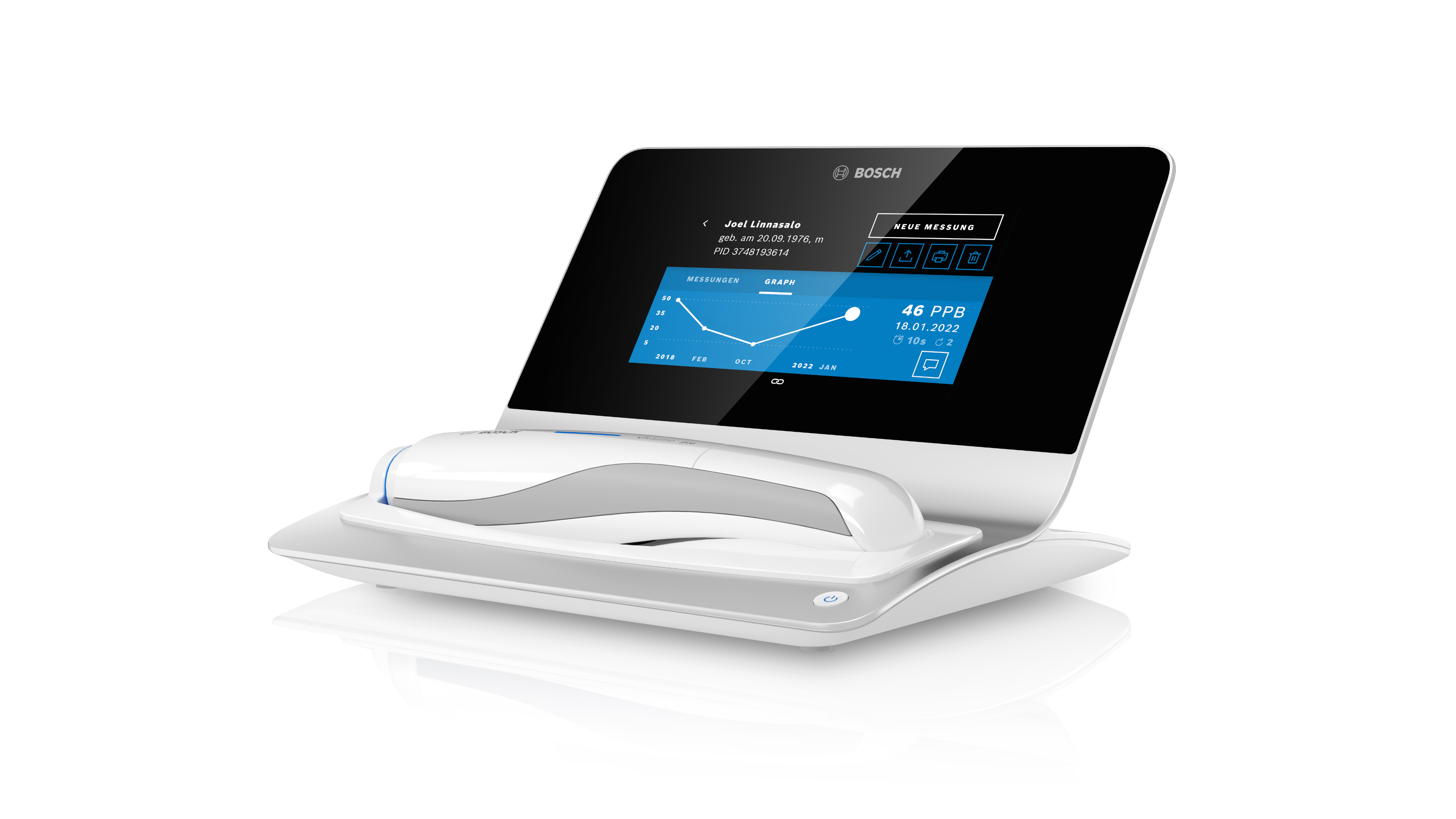 Das FeNO-Messgerät Vivatmo pro von Bosch besteht aus Basisstation und kabellosem Handmessgerät.