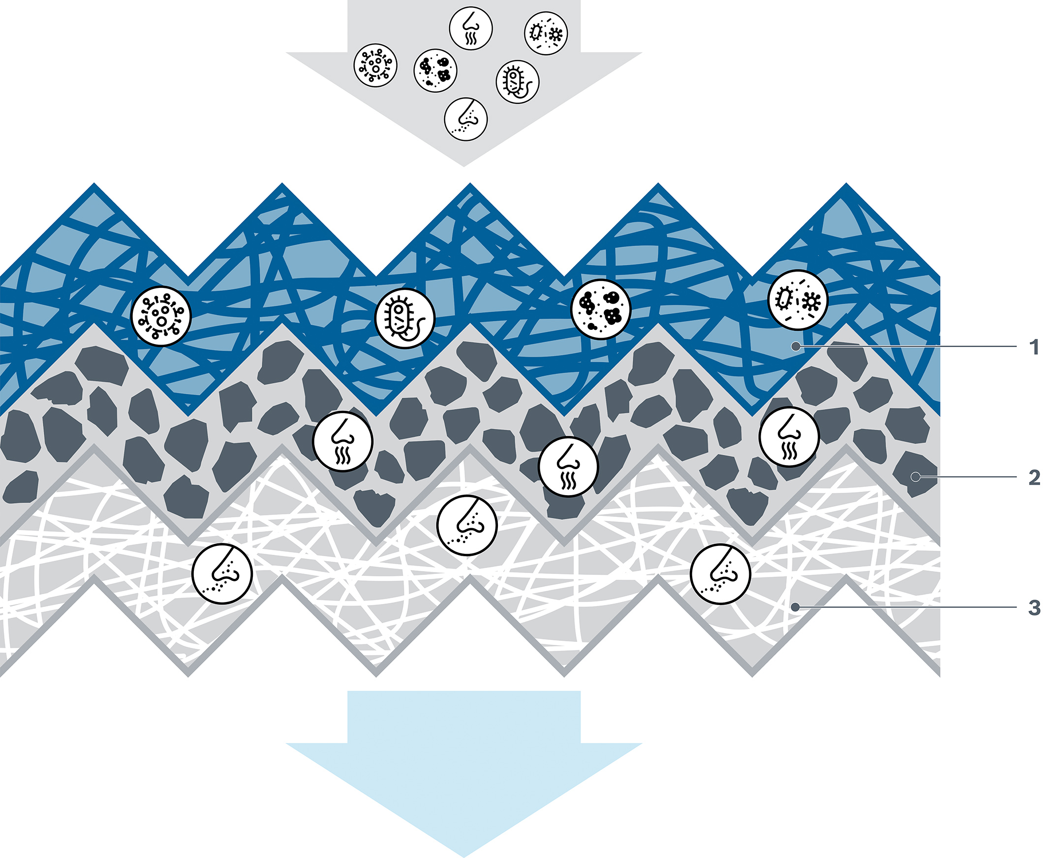 Durch eine sorgfältige Abstimmung mehrerer Filterschichten zeichnet sich der FILTER+pro insbesondere als ideale Lösung für Allergiker aus. Die erste antimikrobielle Schicht bietet Schutz vor Viren, Bakterien, Schimmel und Allergenen. Die zweite Aktivkohle-Schicht hält schädliche und unangenehme Gase zuverlässig fern. Abschließend trägt die ultrafeine Mikrofaserschicht dazu bei, Feinstaub effektiv zu filtern.