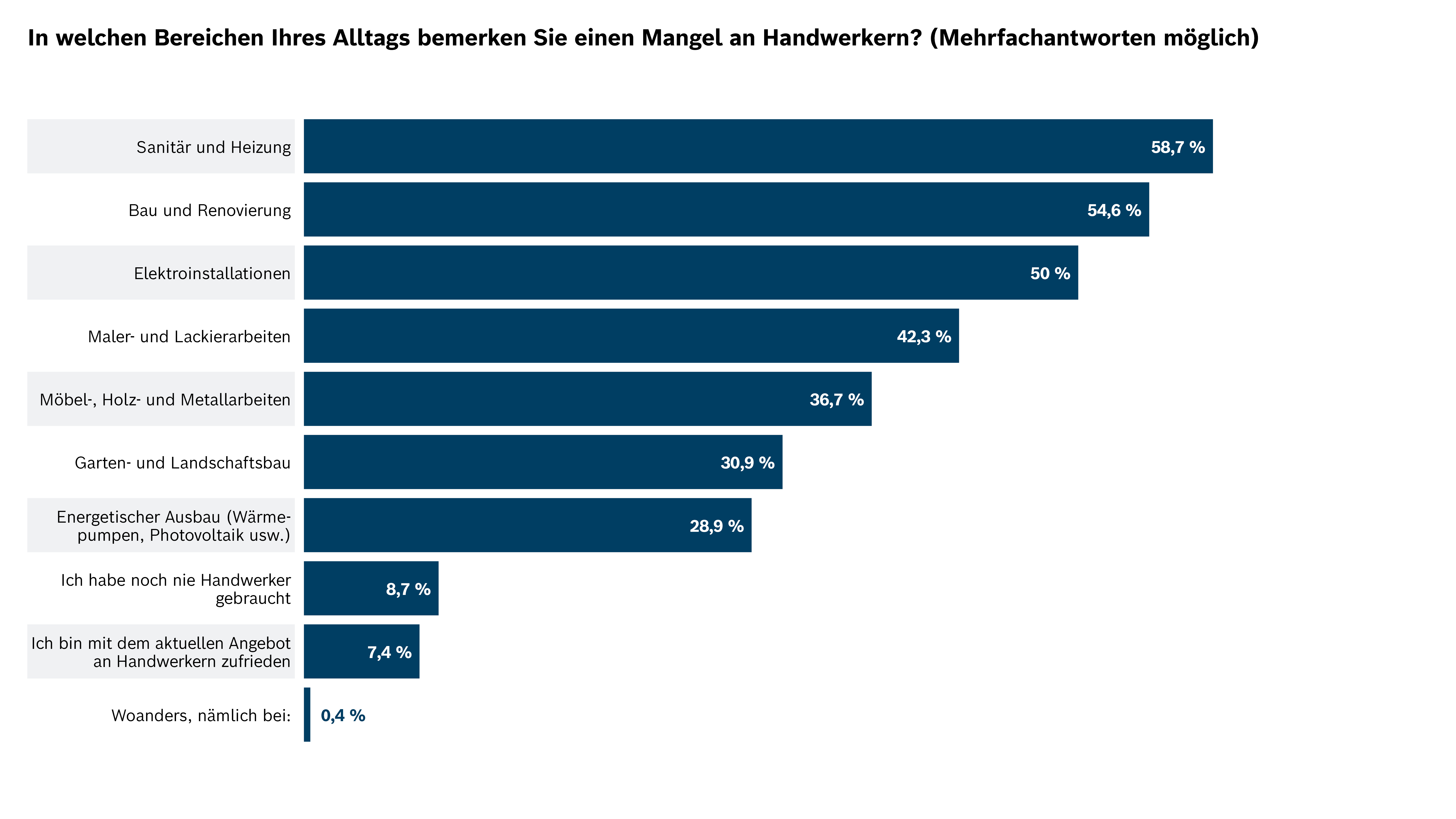 Der Fachkräftemangel wird in verschiedenen Regionen Deutschlands unterschiedlich stark wahrgenommen. Bundesweit am stärksten betroffen ist der Bereich Sanitär und Heizung, wo 58,7 % der Befragten einen Mangel spüren.