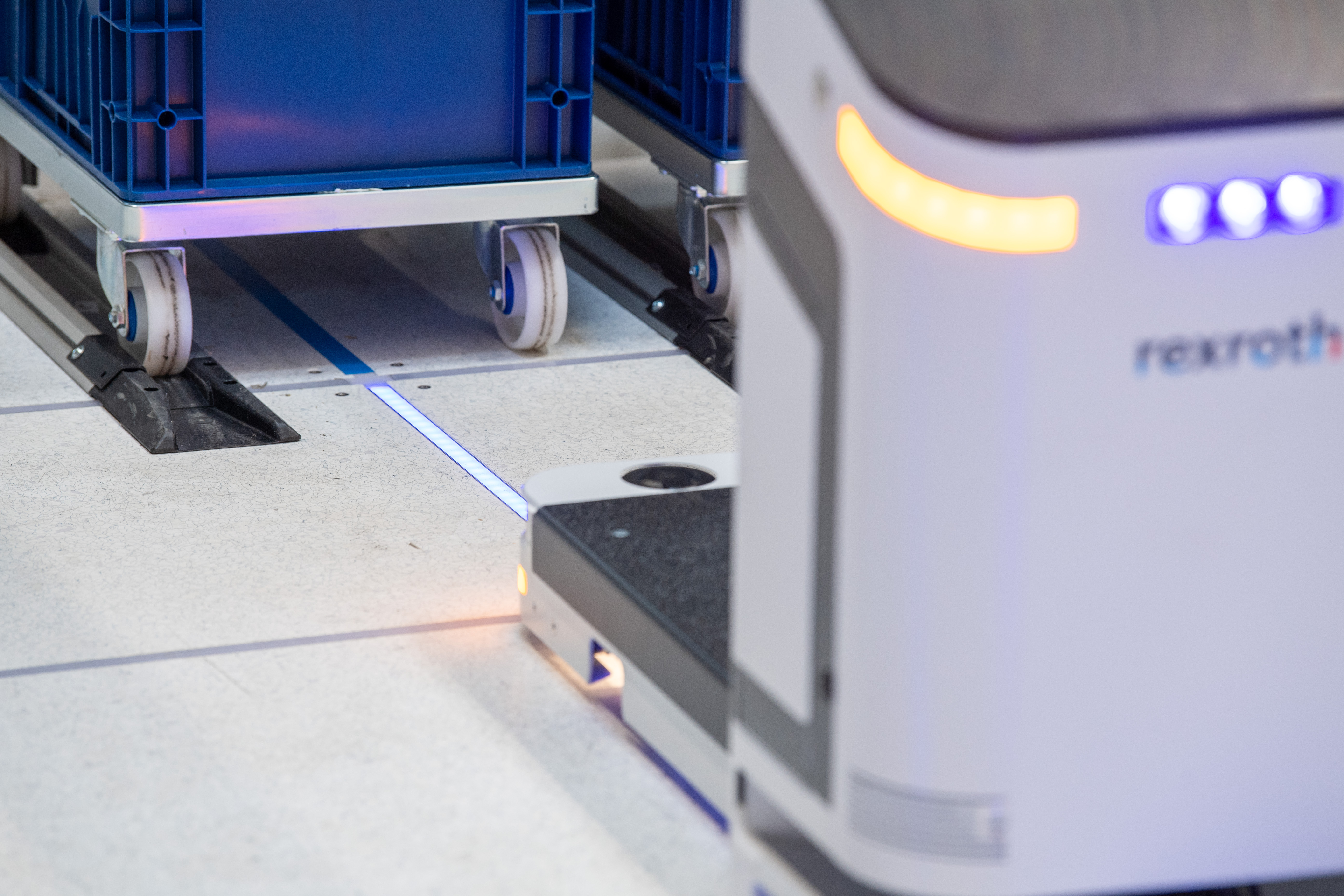 Mit dem intelligenten Boden von Bosch Rexroth wird selbst der Untergrund flexibel und passt sich der Produktion an. LED-Leuchtbänder zeigen jederzeit anpassbare Fahr- und Laufwege.