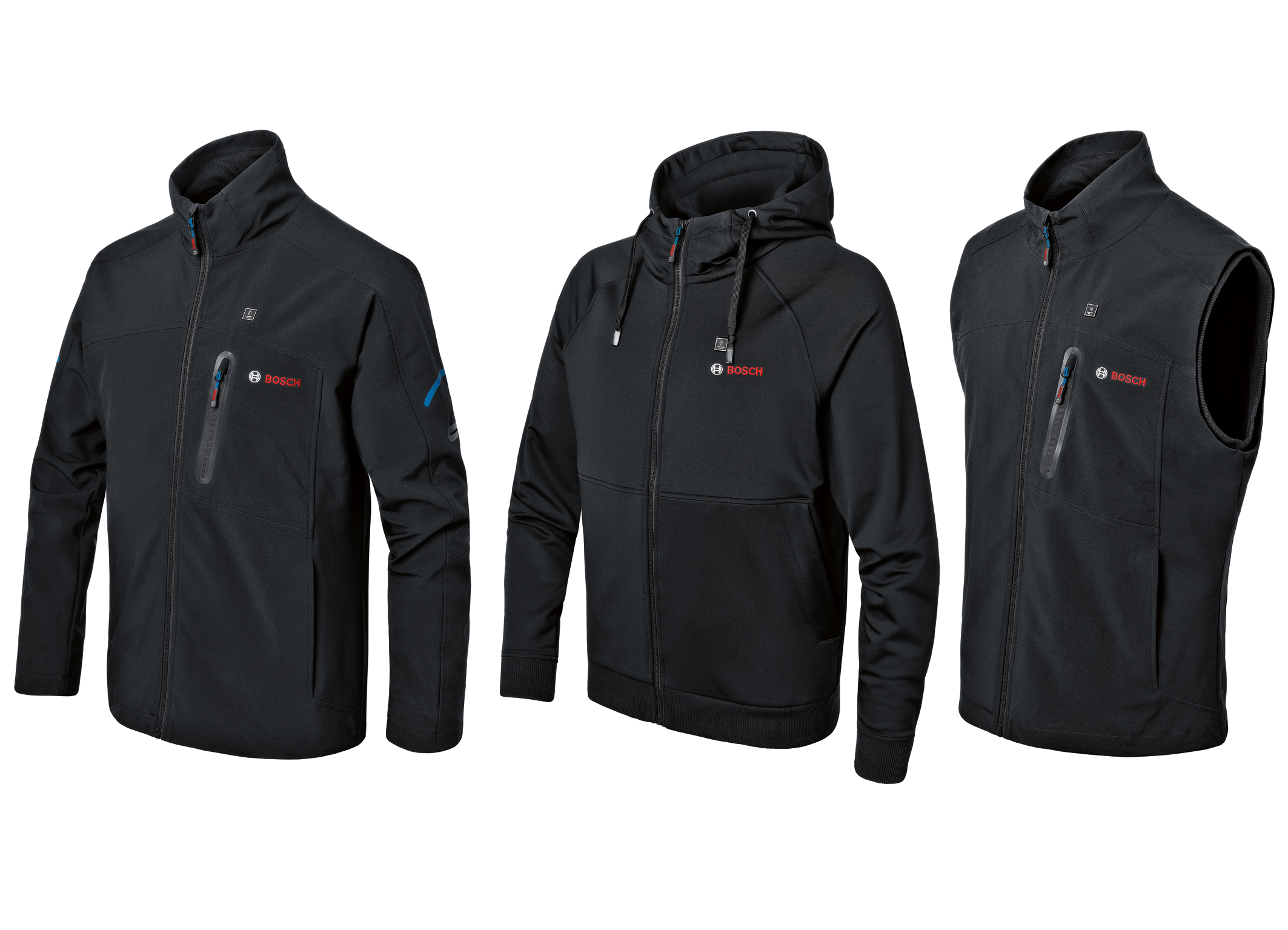 Ob bei Minusgraden auf der Baustelle oder im zugigen Rohbau – mit der neuen beheizbaren Jacke GHJ 12+18V XA Professional (links) sind Profis binnen drei Minuten auf „Betriebstemperatur“. Bosch hat das Sortiment beheizbarer Arbeitskleidung auf Basis von Kundenbedürfnissen weiterentwickelt und bietet jetzt zusätzlich auch den Hoodie GHH 12+18V XA Professional (Mitte) sowie die Weste GHV 12+18V XA Professional (rechts) an. Sie werden mit einem 12 oder 18 Volt-Akku der Profi-Serie von Bosch beheizt. Die Karbon-Heizelemente im Brust- und Rückenbereich sind per Adapter mit dem Akku verbunden und sorgen für eine optimale Wärmeverteilung. Jacke, Hoodie und Weste sind jeweils in den Unisex-Größen S bis 3XL erhältlich.