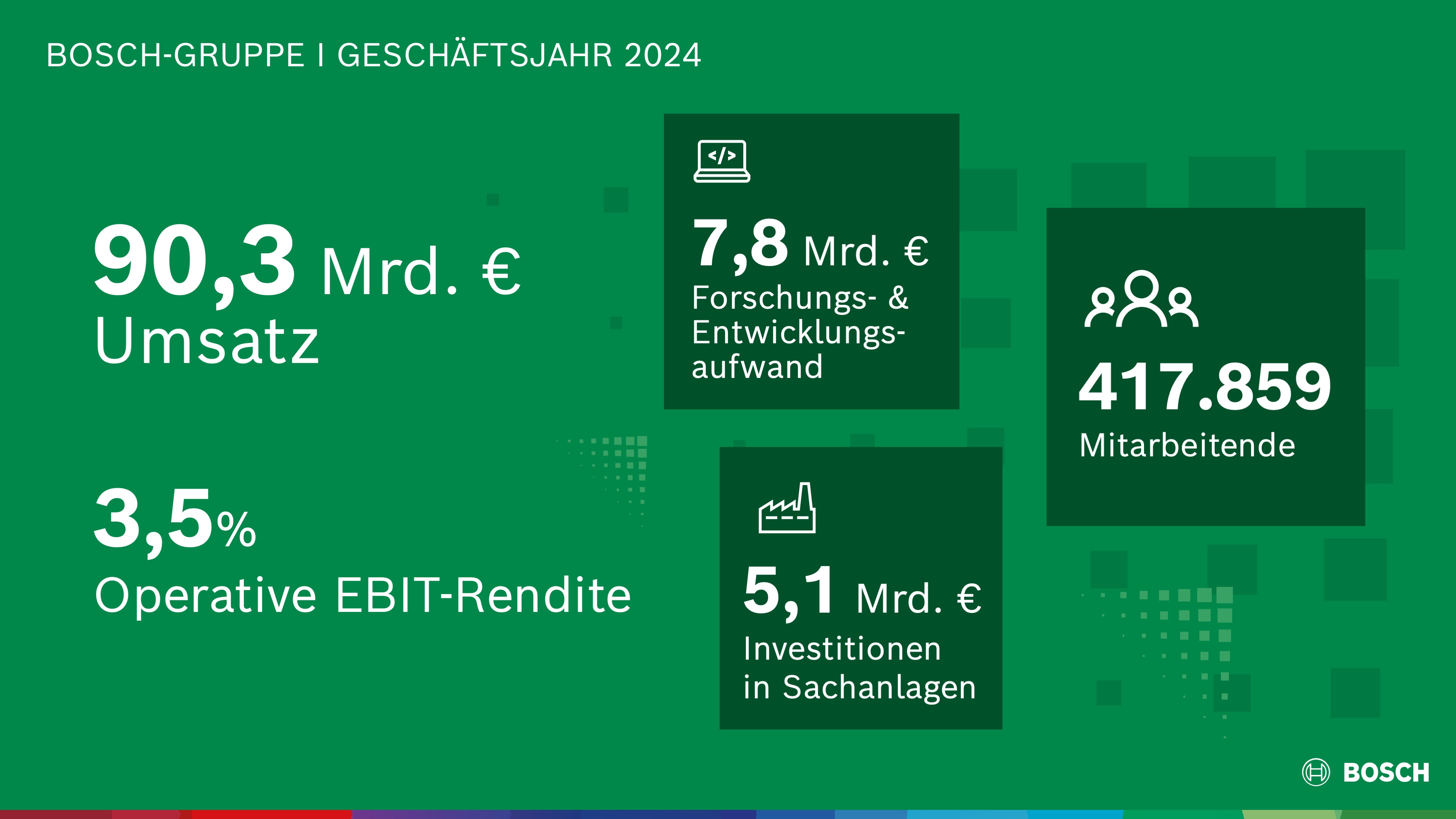 Die Bosch-Gruppe setzt ihre ambitionierte Strategie 2030 zur Stärkung der Wettbewerbsposition fort, auch wenn das Marktumfeld das Wachstum im vergangenen Jahr deutlich bremste: Mit 90,3 Milliarden Euro erwirtschaftete das Technologie- und Dienstleistungsunternehmen 2024 1,4 Prozent weniger Umsatz als im Vorjahr. Das operative Ergebnis vor Finanzergebnis und Steuern (EBIT) betrug 3,1 Milliarden Euro, die operative EBIT-Rendite 3,5 Prozent. Die Ausgaben für Forschung und Entwicklung betrugen 2024 7,8 Milliarden Euro. Die Investitionen in Sachanlagen erreichten 5,1 Milliarden Euro. Zusammen ergaben sich daraus Zukunftsinvestitionen von rund 13 Milliarden Euro. Zum Jahresende 2024 beschäftigte die Bosch-Gruppe weltweit 417 859 Menschen.