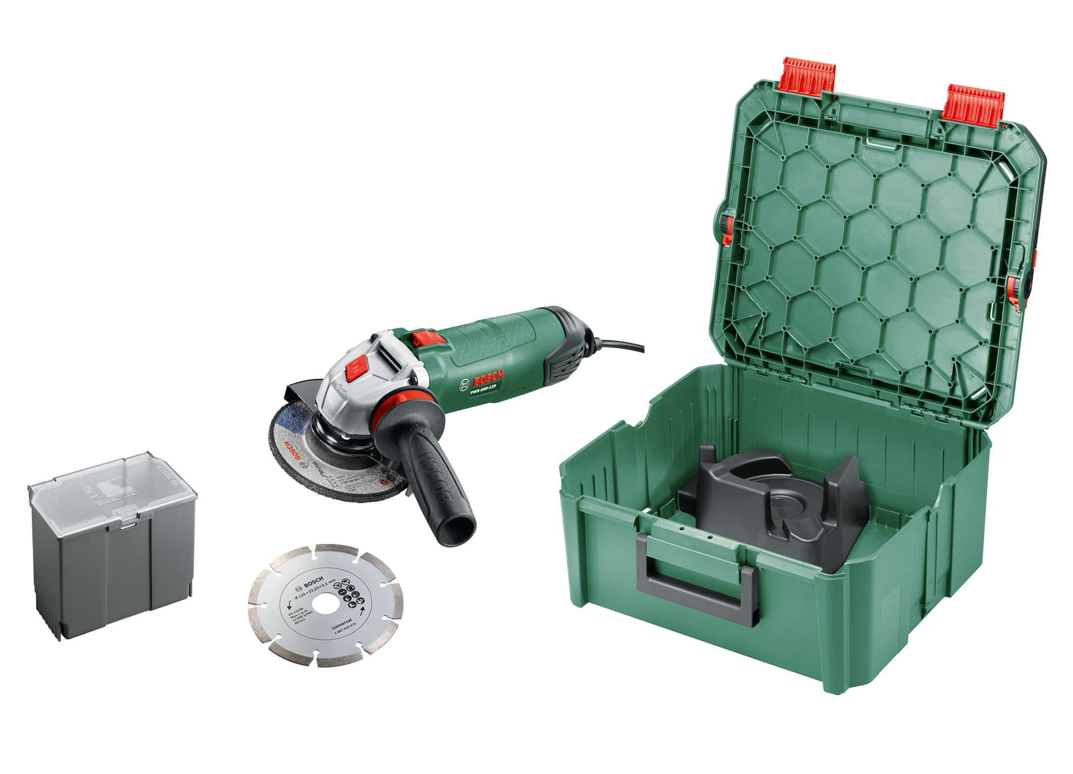 Auch den PWS 850-125 bietet Bosch künftig in der SystemBox M an. Er ist mit 850 Watt der leistungsstärkste Winkelschleifer im Heimwerker-Sortiment und schleift, trennt und bürstet kraftvoll Metall, Stein, Beton und Fliesen. Gleichzeitig ist er leicht und kompakt und dadurch besonders handlich. Im Set enthalten sind jeweils eine Diamant-Trennscheibe und eine Schrupp-Scheibe in der Zubehörbox.