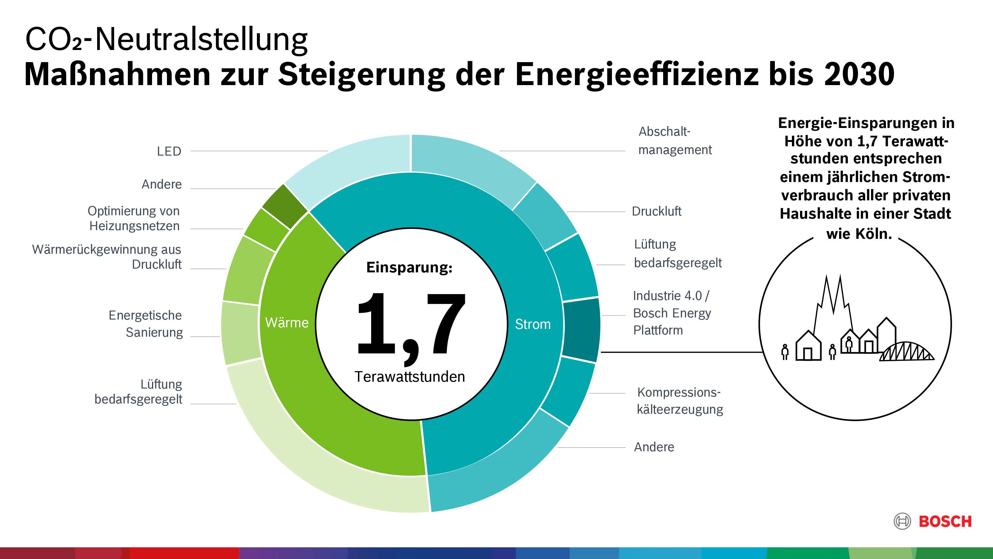 Bis 2030 sollen zusätzliche Energie-Einsparungen in Höhe von 1,7 Terawattstunden pro Jahr realisiert werden, mehr als ein Fünftel des aktuellen Jahresverbrauchs und vergleichbar mit dem Stromverbrauch der privaten Haushalte von Köln. Bosch setzt bereits seit Jahren auf ein konsequentes Umweltmanagement. Allein 2018 wurden rund 500 Energieeffizienz-Projekte weltweit umgesetzt. Wesentlicher Effizienztreiber ist inzwischen auch die Vernetzung der Produktion: Bosch setzt die eigene Energy-Plattform aus dem Industrie-4.0-Lösungsportfolio ein. Die Plattform ist eine cloudbasierte Software-Lösung, die den Stromverbrauch jeder einzelnen Maschine verfolgen und steuern kann.