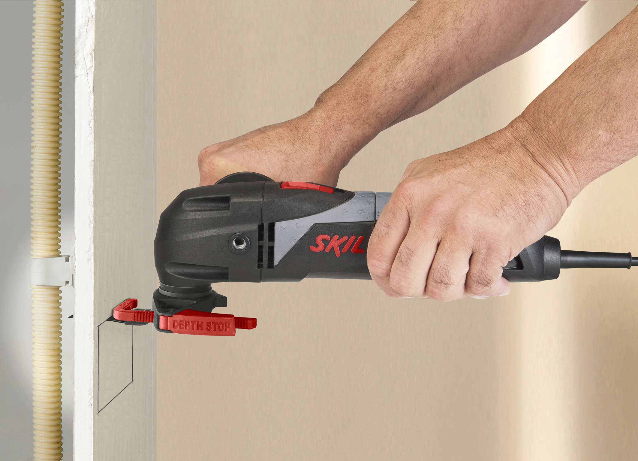Der Skil 1480 eignet sich aufgrund der einfachen Handhabung auch für Heimwerker mit wenig Erfahrung. So verhindert der mitgelieferte Tiefenanschlag, dass Bauteile oder Leitungen, die hinter dem Arbeitsbereich liegen, versehentlich beschädigt werden. Ein Beispiel dafür ist ein Kabel oder Rohr hinter einer Trockenbauwand, in der eine Aussparung für Steckdosen hergestellt werden soll.
