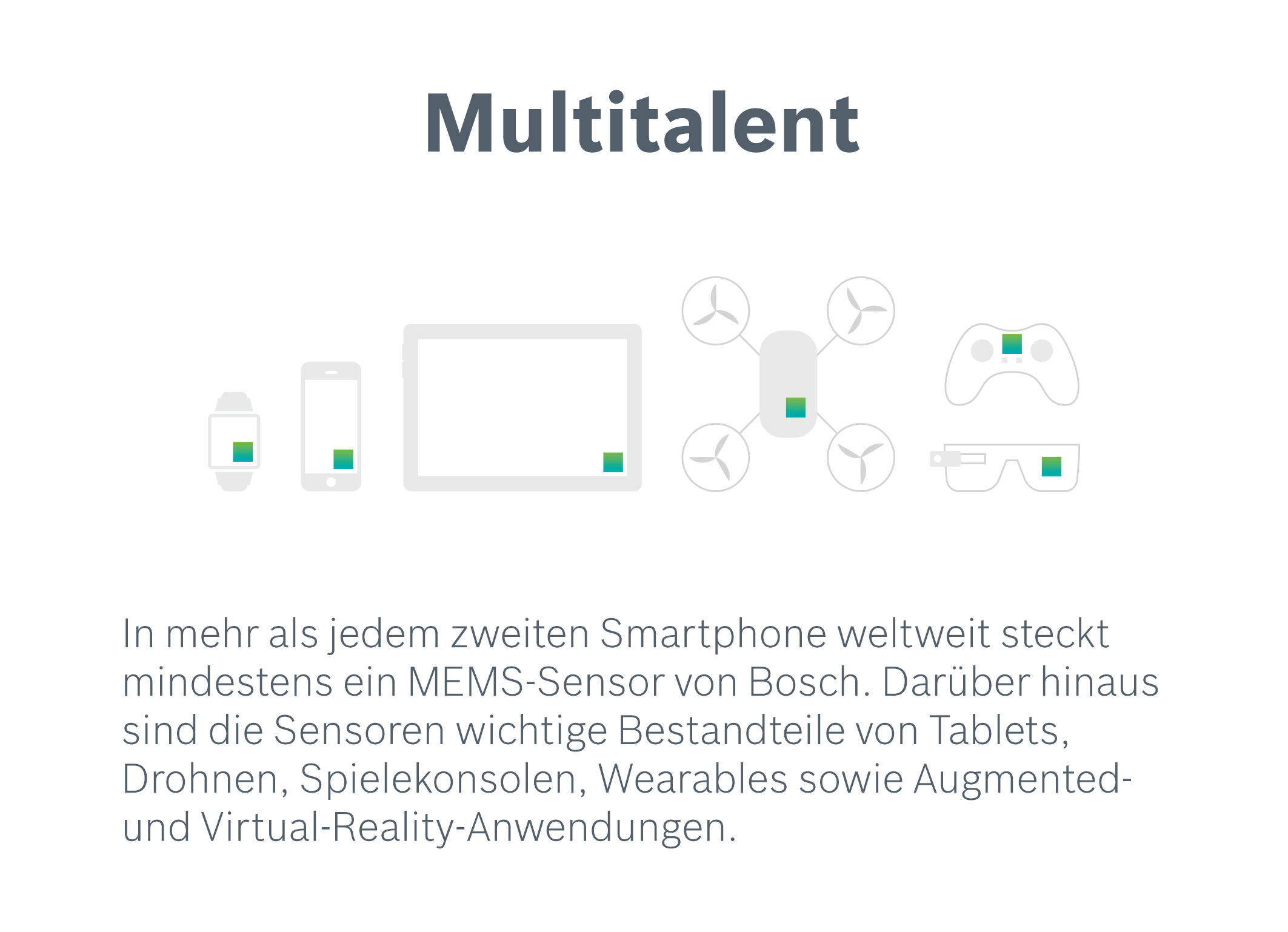 In mehr als jedem zweiten Smartphone weltweit steckt mindestens ein MEMS-Sensor von Bosch. Darüber hinaus sind die Sensoren wichtige Bestandteile von Tablets, Drohnen, Spielekonsolen, Wearables sowie Augmented- und Virtual-Reality- Anwendungen.