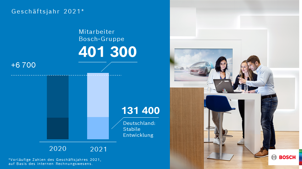 Die Bosch-Gruppe beschäftigte zum Stichtag 31.12.2021 nach vorläufigen Zahlen weltweit rund 401 300 Menschen. Der Zuwachs von etwa 6 700 Mitarbeitenden erfolgte im Wesentlichen in Asien-Pazifik und Europa. Die Mitarbeiterzahl in Deutschland blieb stabil mit etwa 131 400 Beschäftigten. Im Bereich Forschung und Entwicklung ist die Mitarbeiterzahl des Technologie- und Dienstleistungsunternehmens um knapp 4 Prozent auf 76 300 gestiegen. Die Anzahl von Software-Entwicklern lag weltweit bei mehr als 38 000 – das ist ein Plus von etwa 4 000 gegenüber dem Vorjahr.