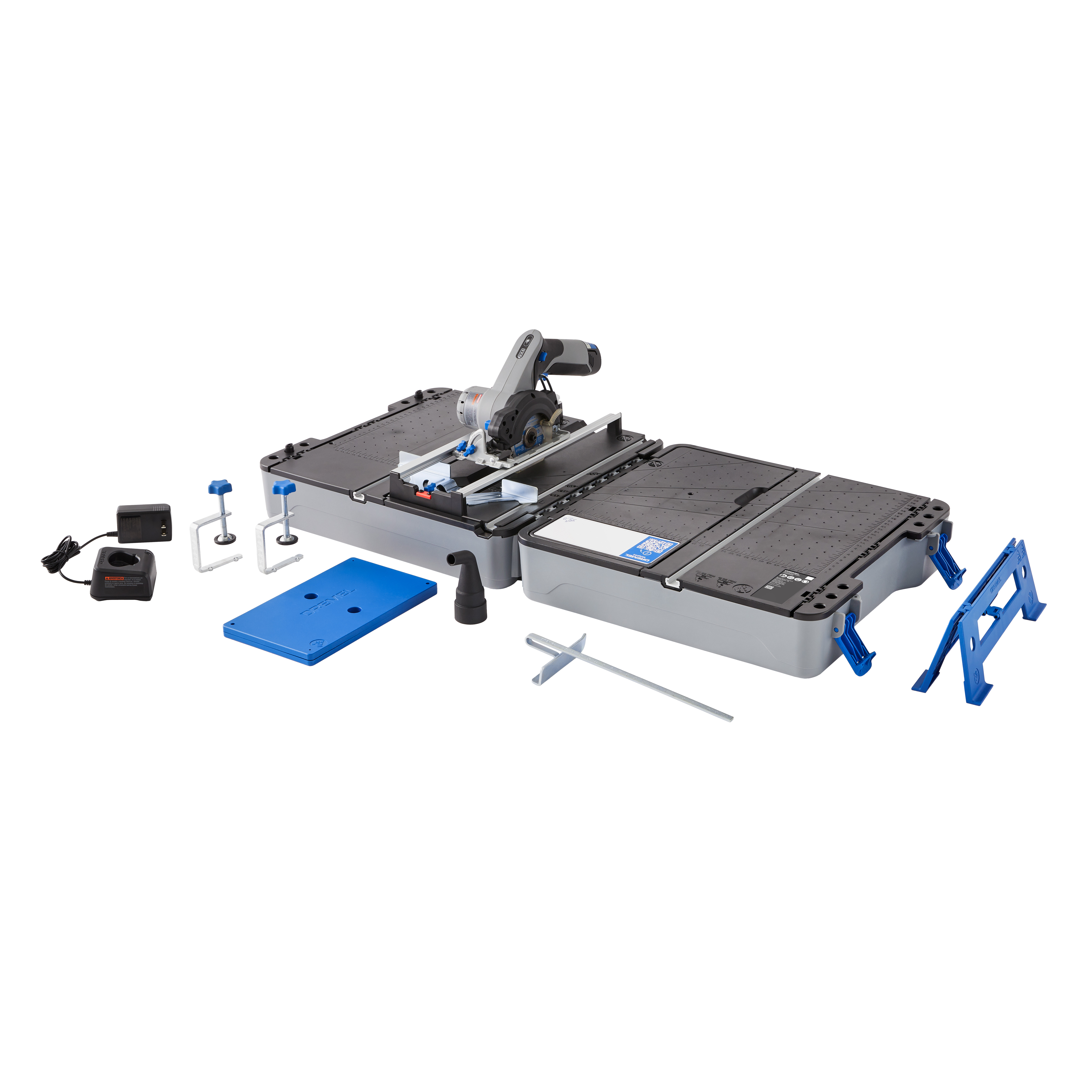Mit der mobilen Sägestation können Hausbesitzer, Mieter und Heimwerker gerade, schräge, Gehrungs- und Längsschnitte problemlos durchführen. Der kompakte Koffer in der Größe eines Pilotenkoffers lässt sich zu einer Arbeitsstation ausklappen, die Führungsschienen, Werkstückstützen und Schraubzwingen enthält.