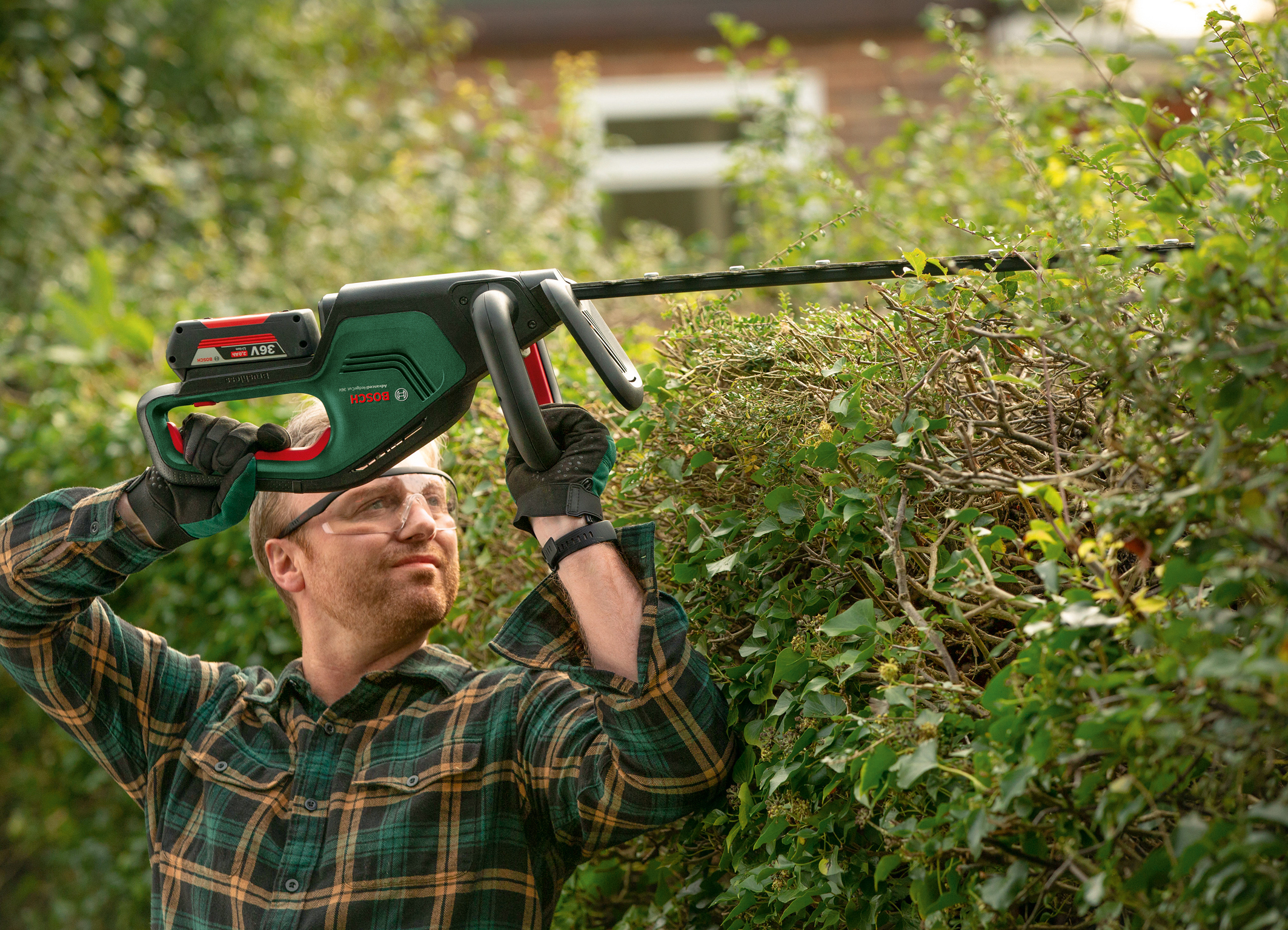 Die AdvancedHedgeCut 36V-65-28 erlaubt unterschiedliche Greif- und Arbeitspositionen. Auf diese Weise lassen sich große und dichte Hecken wie Buchen-, Eiben- und Lorbeerhecken oder auch Schwarz- und Weißdorn-Sträucher kräfteschonend in Form bringen. Weiteres Plus ist das bewährte Bosch Anti-Blockier-System. Es sorgt auch bei dickeren Ästen für einen zügigen und kontinuierlichen Arbeitsfortschritt: Kann ein Ast nicht sofort durchgeschnitten werden, regelt eine Mikro-Elektronik über den Motor die Laufrichtung der Messer. Sie setzen so lange an derselben Stelle an, bis der Ast durchtrennt ist. Dieses System bietet nur Bosch.