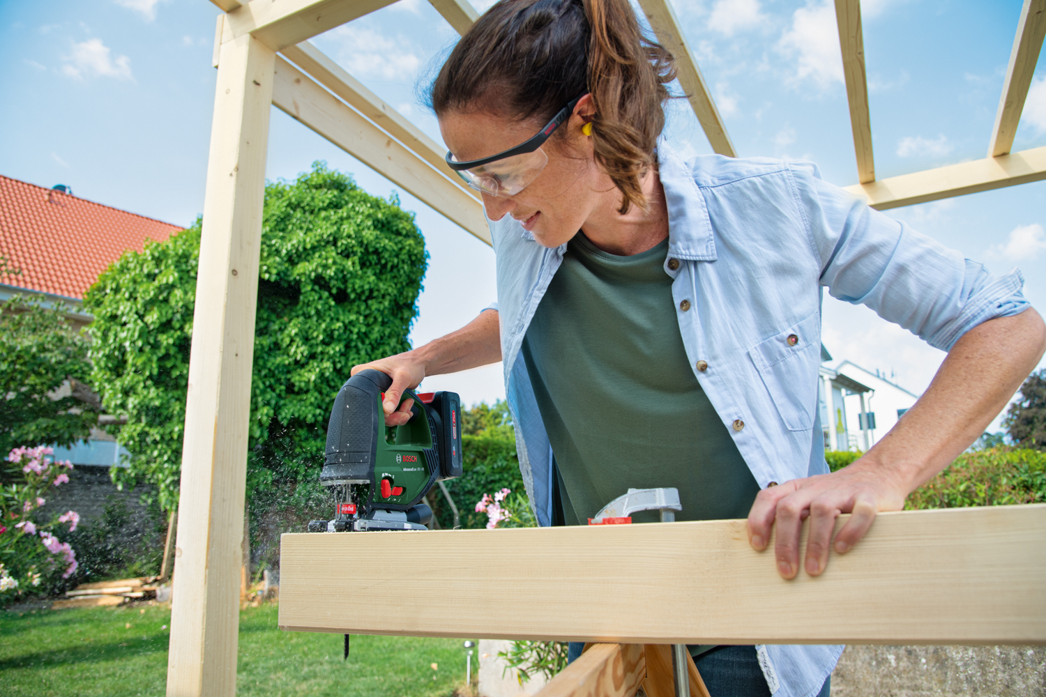 Mit einer Schnitttiefe von bis zu 140 Millimetern in Holz sägt die neue Akku-Stichsäge AdvancedSaw 18V-140 von Bosch tiefer als vergleichbare Wettbewerber-Modelle und eignet sich daher beispielsweise für den Zuschnitt von Balken für den Bau einer Pergola. Auch das Ablängen von Rohren aus Kunststoff oder Aluminium oder das Zusägen von Fußleisten kann mit der AdvancedSaw 18V-140 mühelos bewältigt werden. Die robuste Aluminiumfußplatte kann außerdem im 45-Grad-Winkel angesetzt werden, um Gehrungsschnitte durchzuführen.