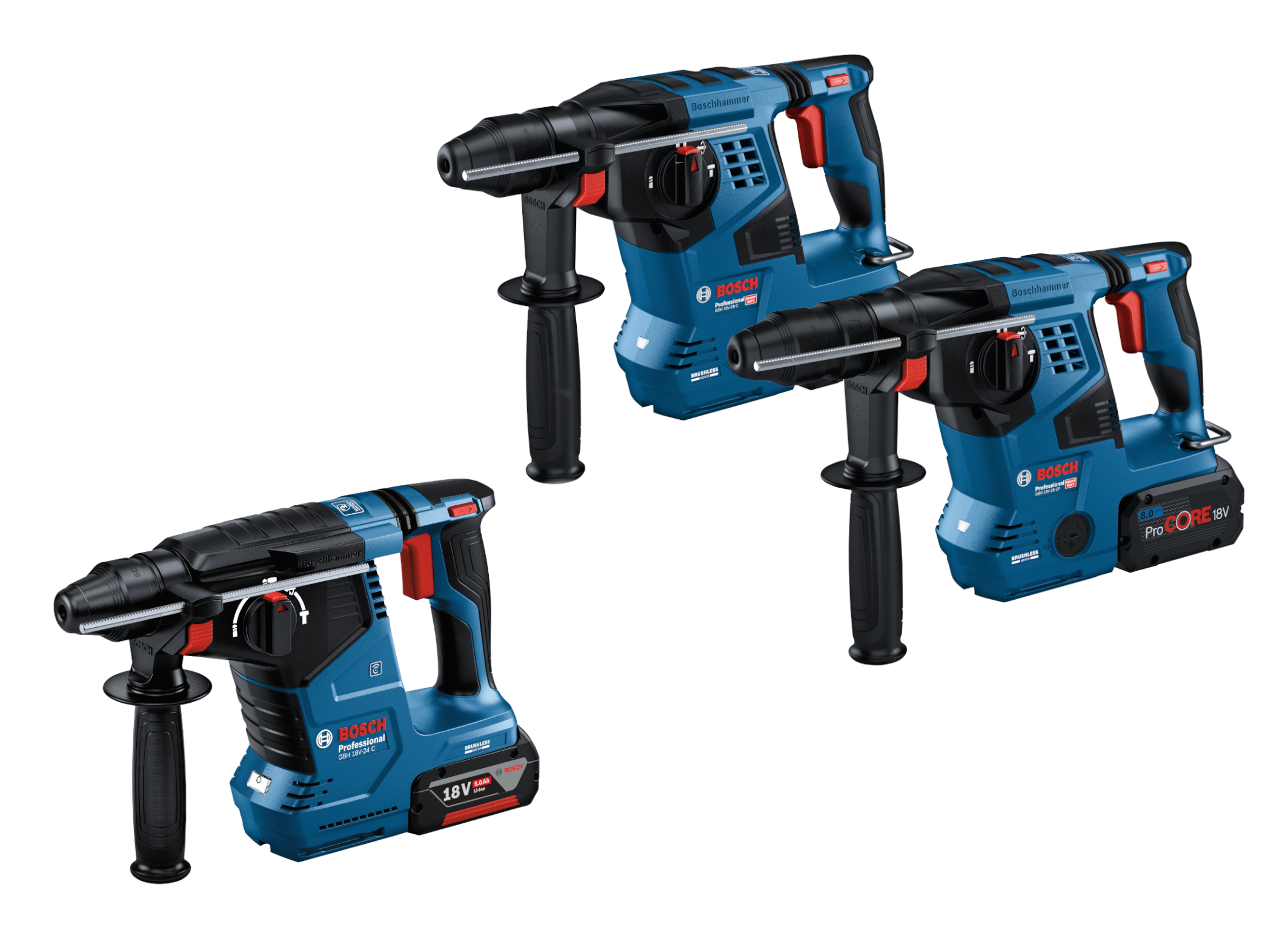 Mit den Akku-Bohrhämmern GBH 18V-24 C Professional und GBH 18V-28 C/CF Professional erweitert Bosch sein Portfolio für gewerbliche Verwender. Die Geräte unterscheiden sich durch ihre Funktionen und Bohrdurchmesser: Beim GBH 18V-24 C Professional liegen die optimalen Bohrdurchmesser bei acht bis 14 Millimetern, maximal 24 Millimeter. Beim GBH 18V-28 C/CF Professional sind es acht bis 18 Millimeter, maximal 28 Millimeter. Gewählt werden kann hier außerdem zwischen dem Modell mit Festfutter (C) und dem Modell mit Wechselfutter (CF). Das „Professional 18V System“ deckt darüber hinaus alle weiteren maßgeblichen Anwendungen mit 18 Volt ab – und geht dank herstellerübergreifender AmpShare-Allianz sogar über das Angebot von Bosch hinaus. Viele Marken, viele Maschinen, ein Akku-System: Alle Geräte lassen sich mit ein und demselben 18 Volt Lithium-Ionen-Akku und nur einem Ladegerät betreiben. Das spart Handwerkern Zeit, Platz und Geld.