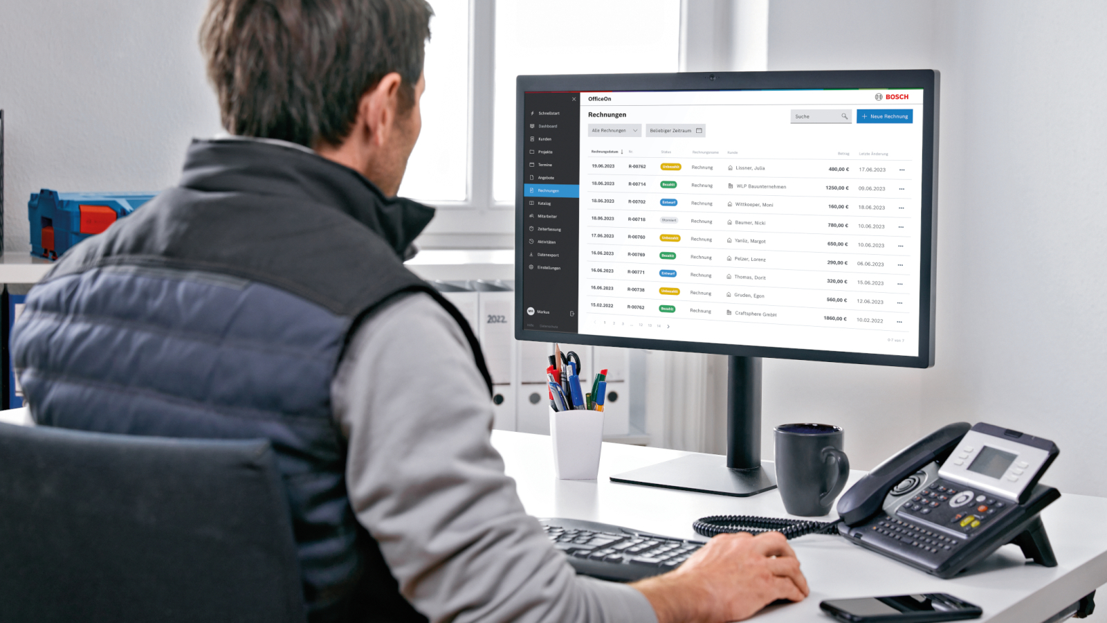 Ziel der Handwerker-Software OfficeOn von Bosch ist es, kleineren Betrieben die Büroarbeit so einfach wie möglich zu machen, sodass sie sich auf ihr Handwerk konzentrieren können. Über die Web-Anwendung können im Büro alle Aufgaben schnell und einfach erledigt werden: von der Projektplanung über Angebots- und Rechnungserstellung sowie Koordination von Terminen bis hin zur Verwaltung des Kundenstamms. Für die Erstellungen von Angeboten und Rechnungen lassen sich eigene Leistungen wie Stundenlöhne bequem anlegen und abrufen. Fremdleistungen von Großhändlern sind durch eine Schnittstelle per Datanorm und IDS ebenfalls schnell importiert und berücksichtigt. Über die normkonforme Datev-Schnittstelle können Betriebe ihre Daten außerdem direkt an den Steuerberater oder das Finanzamt übermitteln. Das spart Zeit und Geld.