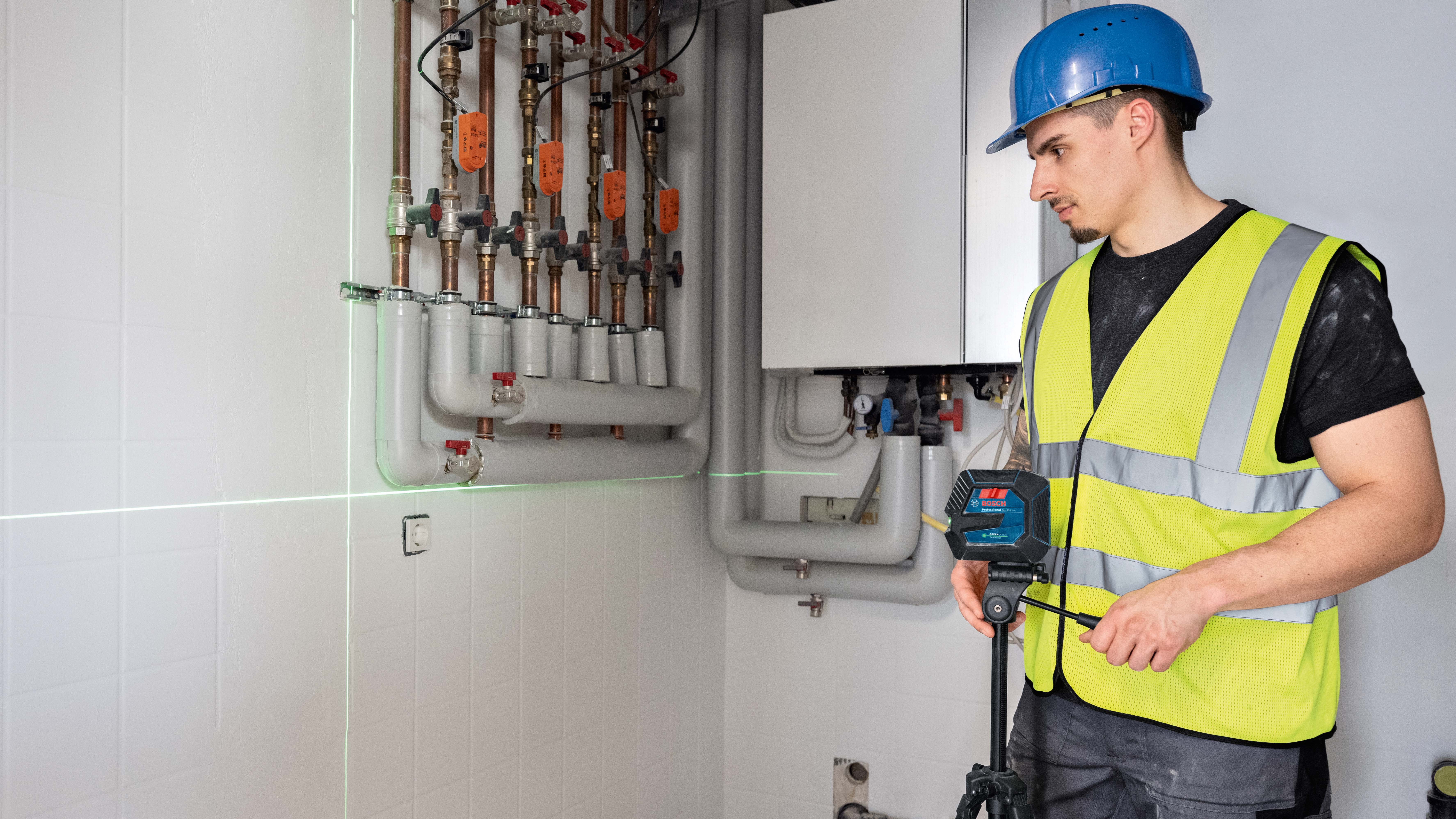 Der kompakte Kreuzlinienlaser GLL 20-22 G Professional projiziert in einem Arbeitsbereich bis 20 Meter ein exaktes Laserkreuz nach vorne. Er erleichtert Profis präzises Ausrichten im Innenbereich, etwa beim Installieren von Rohren und Leitungen. Durch das neue U-förmige Frontfenster ist der horizontale Öffnungswinkel jetzt weiter und die Laserlinie dadurch länger als bei bisherigen Geräten. Als Energiequellen dienen der neue 3,7 Volt-Lithium-Ionen-Akku für bis zu acht Stunden Laufzeit oder vier AA-Batterien für bis zu sechs Stunden Laufzeit.